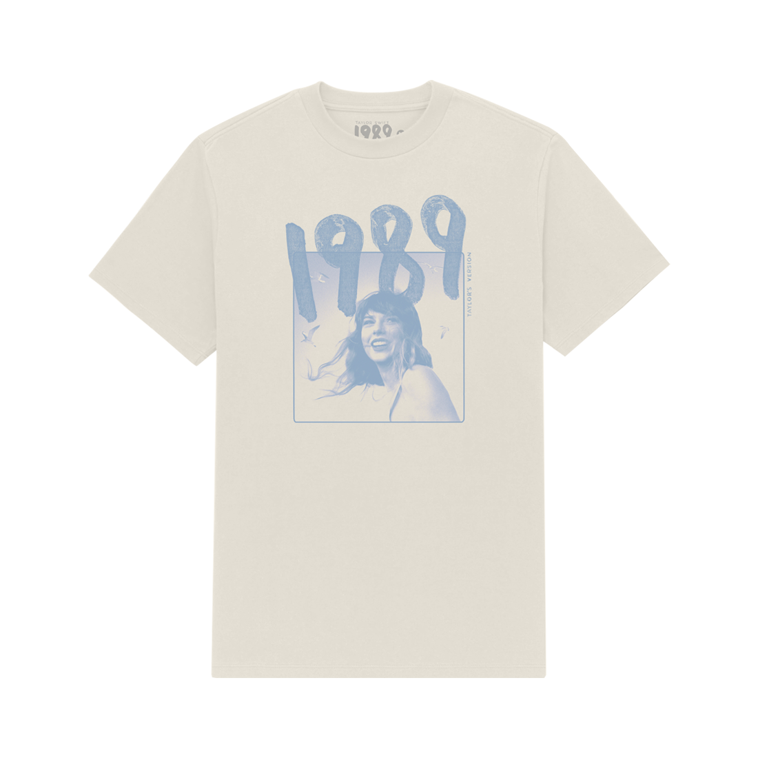 Off white t-shirt featuring 1989 (Taylor's Version) album cover photo of Taylor Swift and "1989 (Taylor's Version)" printed on front.