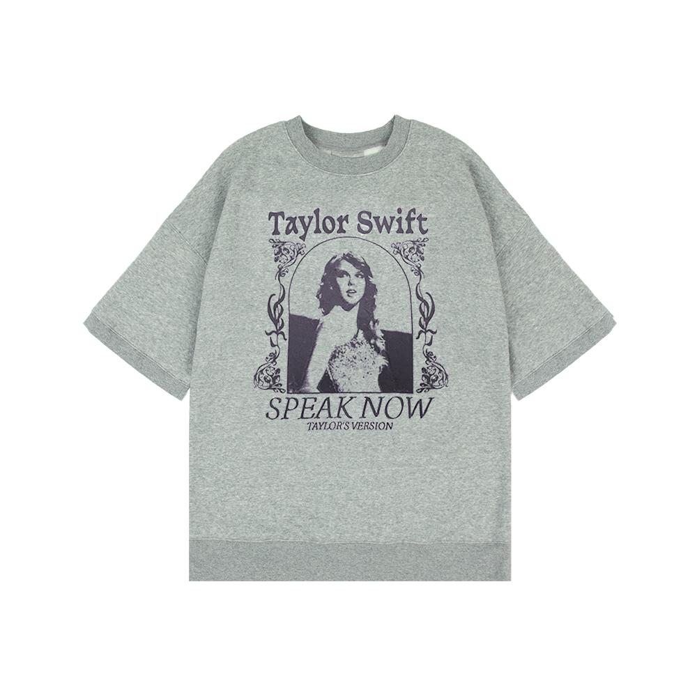 Heather gray fleece t-shirt featuring photo of Taylor Swift with "Taylor Swift" and "Speak Now Taylor's Version" with floral vine design printed on front.