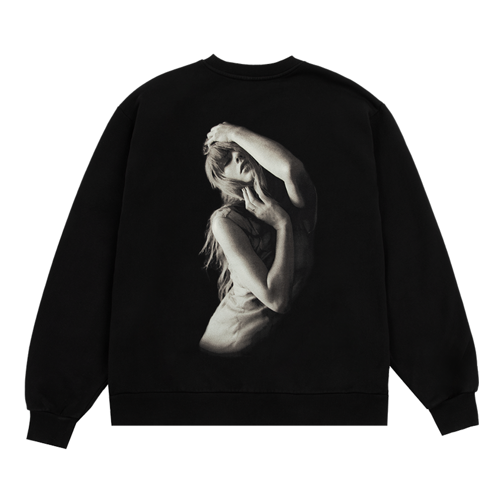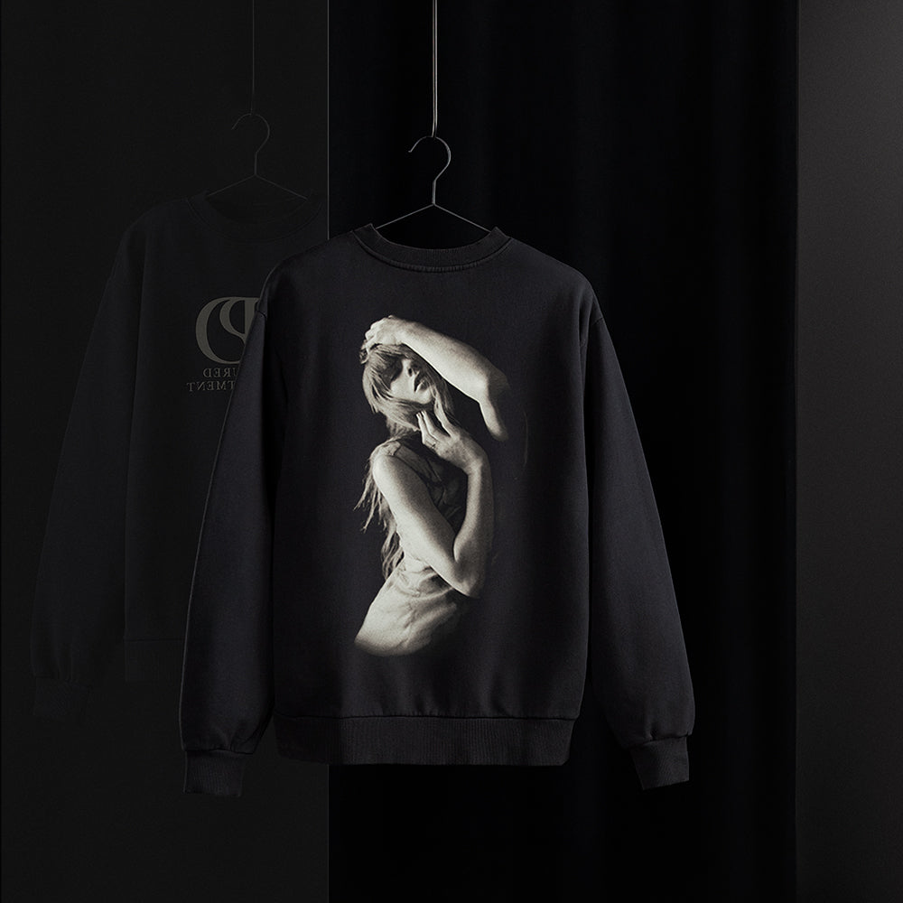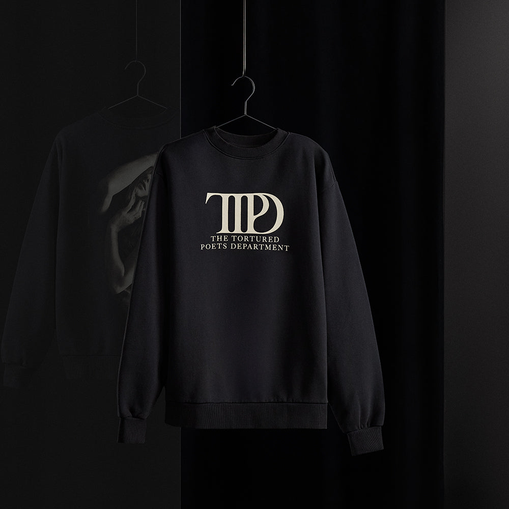 Ink black crewneck featuring gray "TTPD" album logo and "The Tortured Poets Department" printed on front and photo of Taylor Swift printed on back.