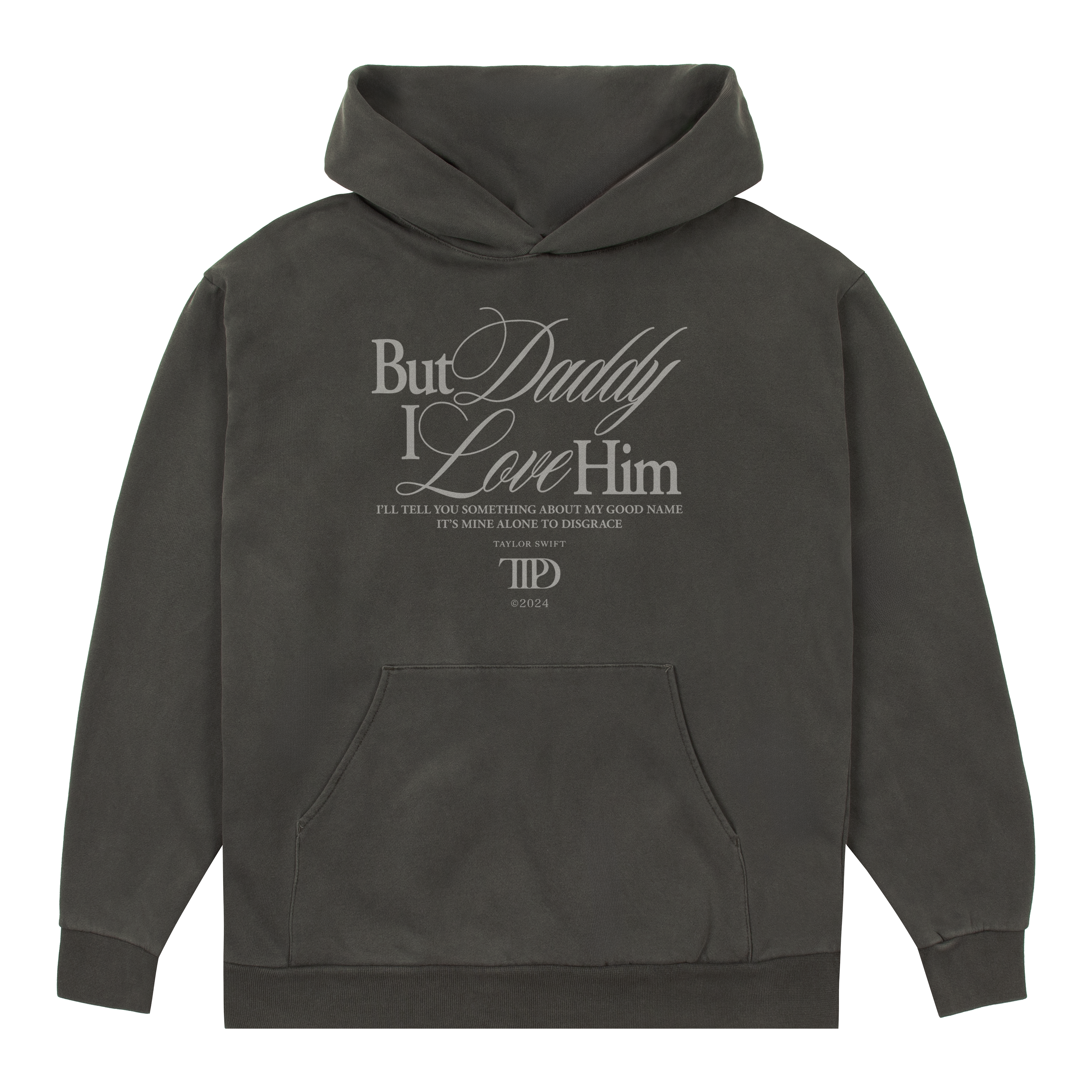 Gray hoodie with front pocket featuring "But Daddy I Love Him" song lyrics, "I'll Tell You Something About My Good Name It's Mine Alone To Disgrace" song lyrics, "Taylor Swift", "TTPD" album logo, and "©2024" printed on back front.