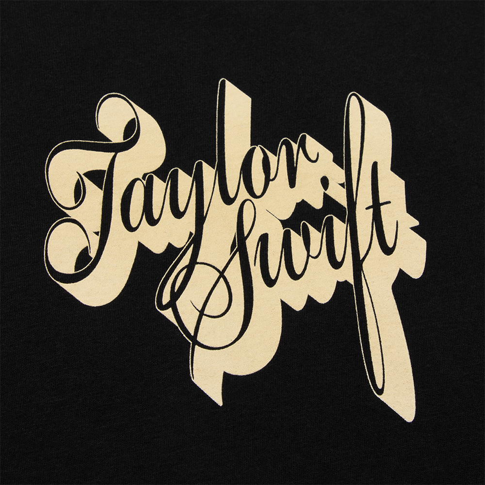 Black t-shirt featuring "Taylor Swift" printed on front with photos of Taylor Swift and the words "Cause I Don't Know How It Gets Better Than This" and "Taylor Swift" with star and vine design printed on back.