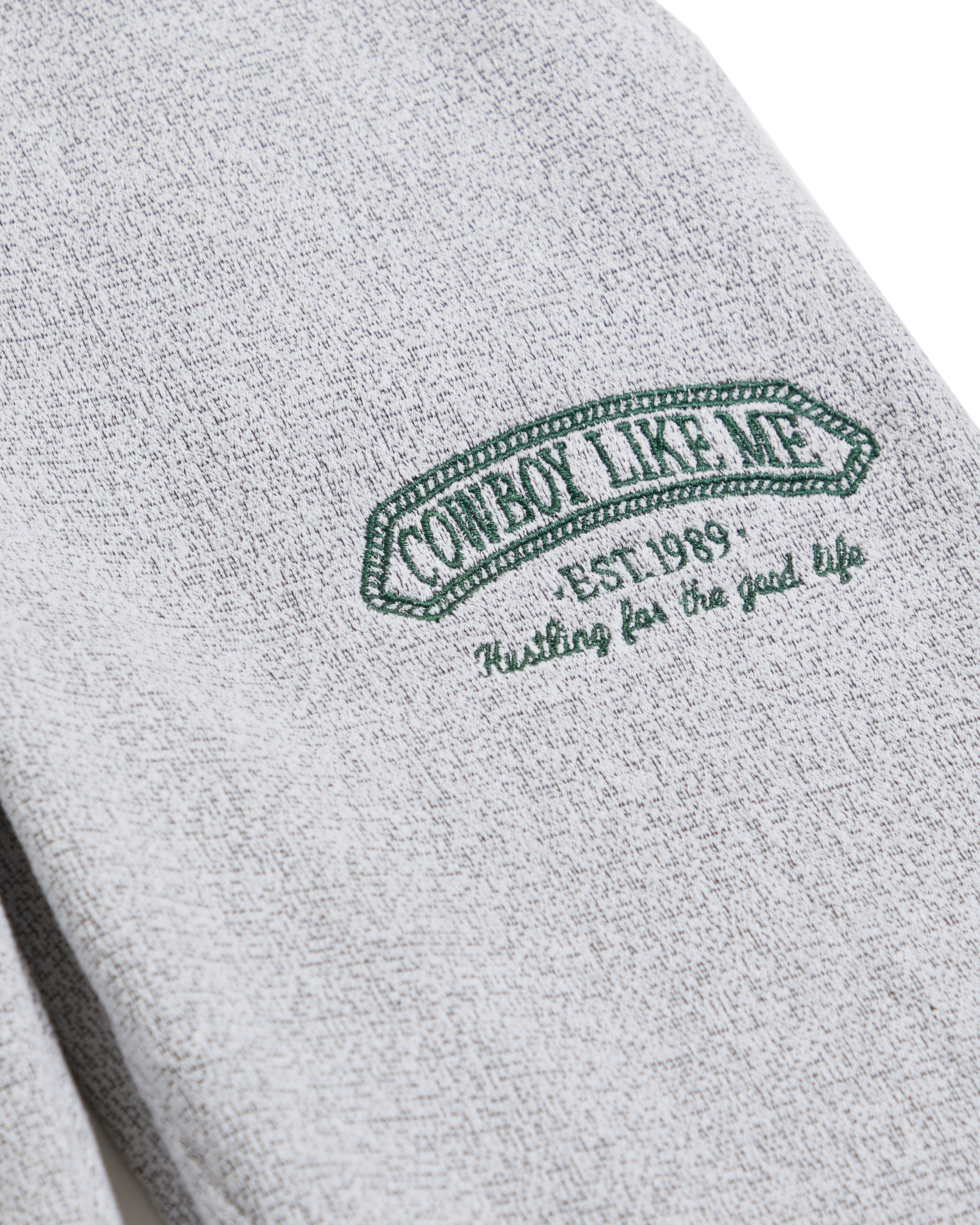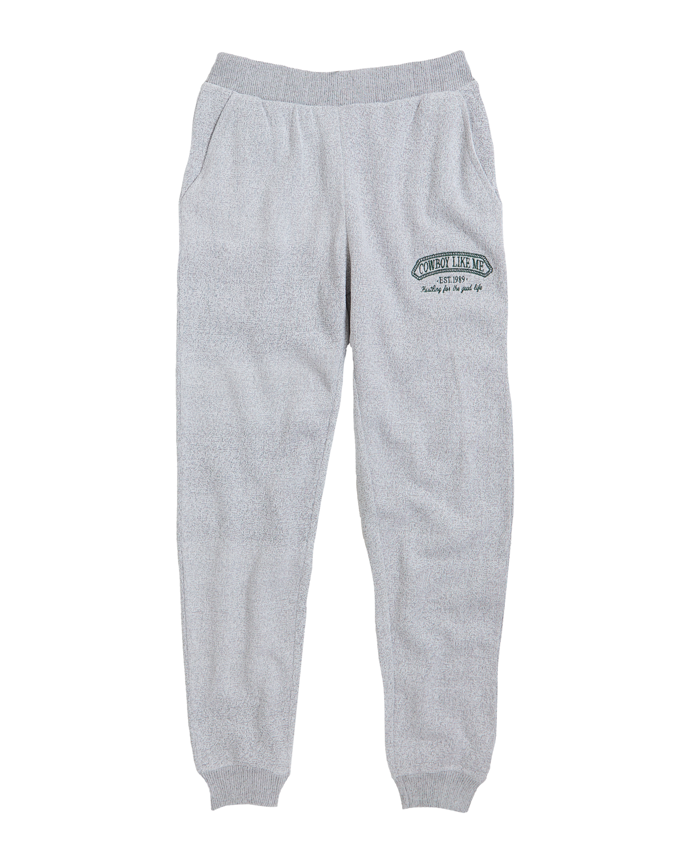 Gray plush textured knit joggers with elastic waist and side pockets featuring "Cowboy Like Me" song title and "Est. 1989" with "Hustling for the good life" song lyrics embroidered on wearer's front left leg.