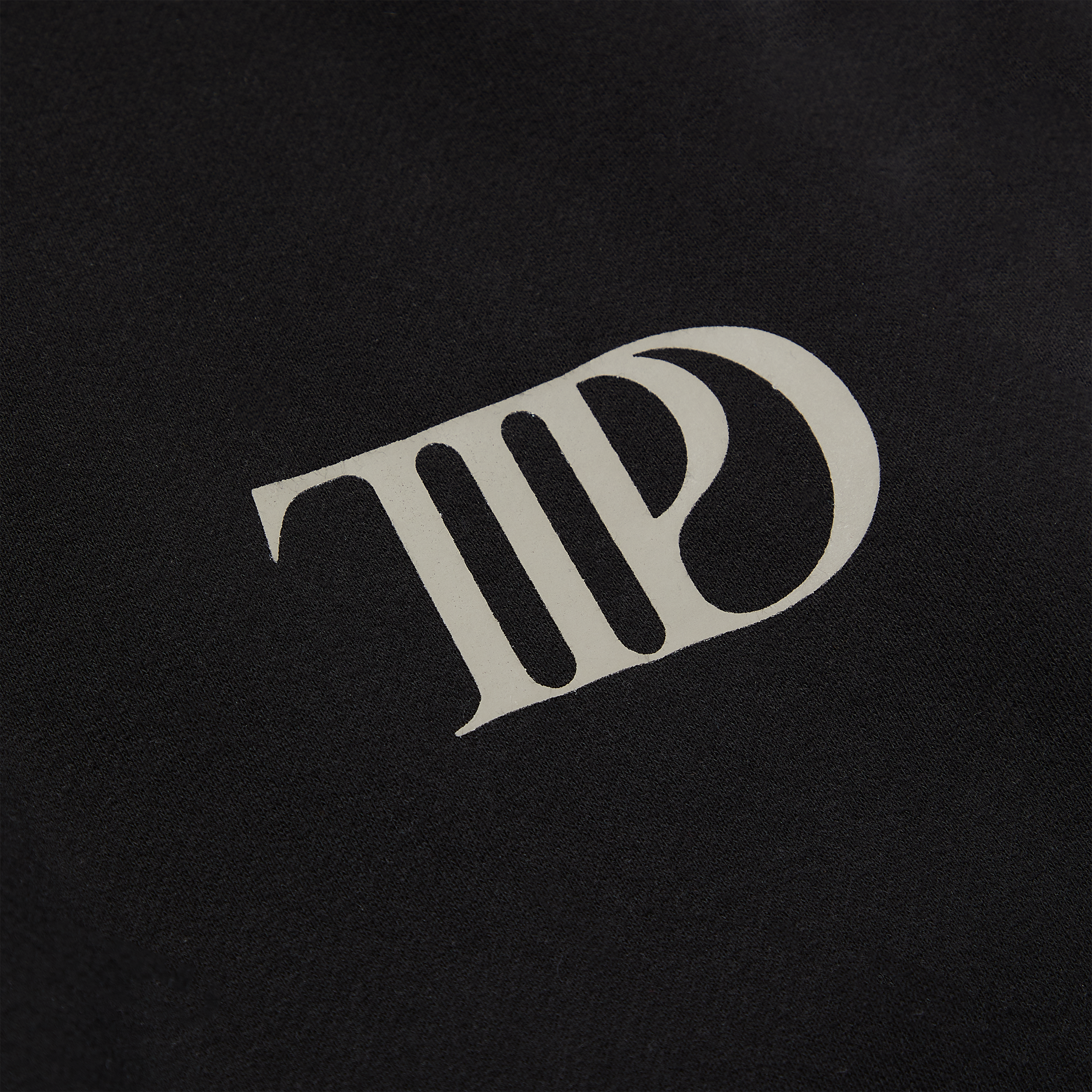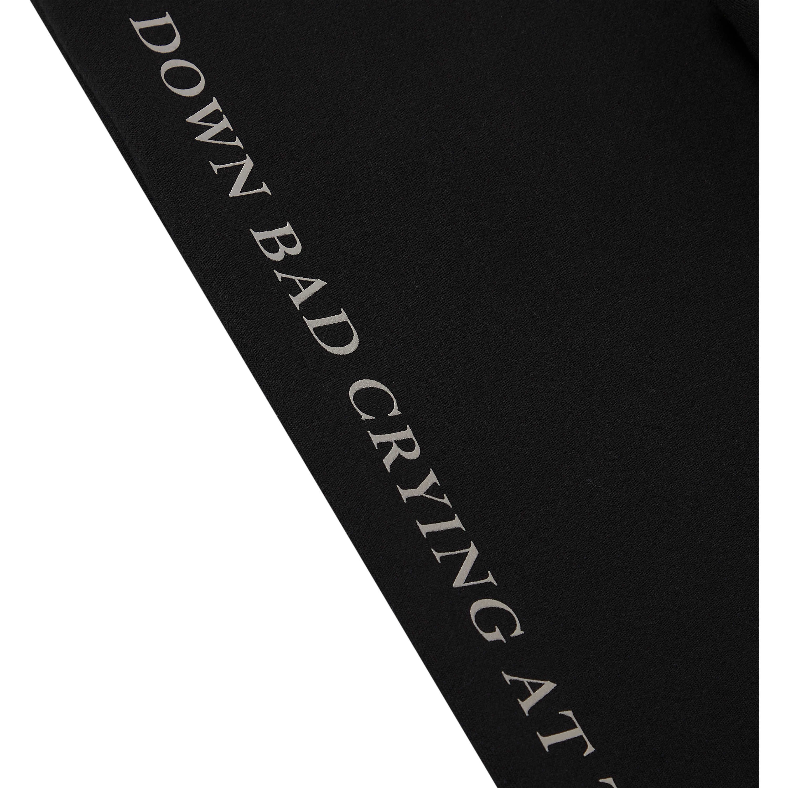 Black sweatpants featuring "Down Bad Crying At The Gym" printed down wearer's right leg and "TTPD" album logo printed on wearer's left leg. Drawstring waist and side pockets.