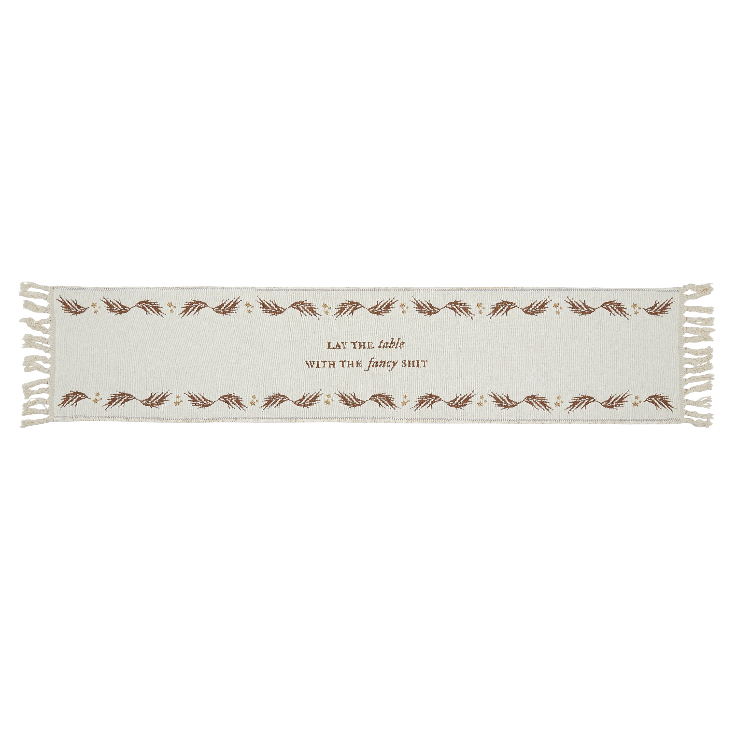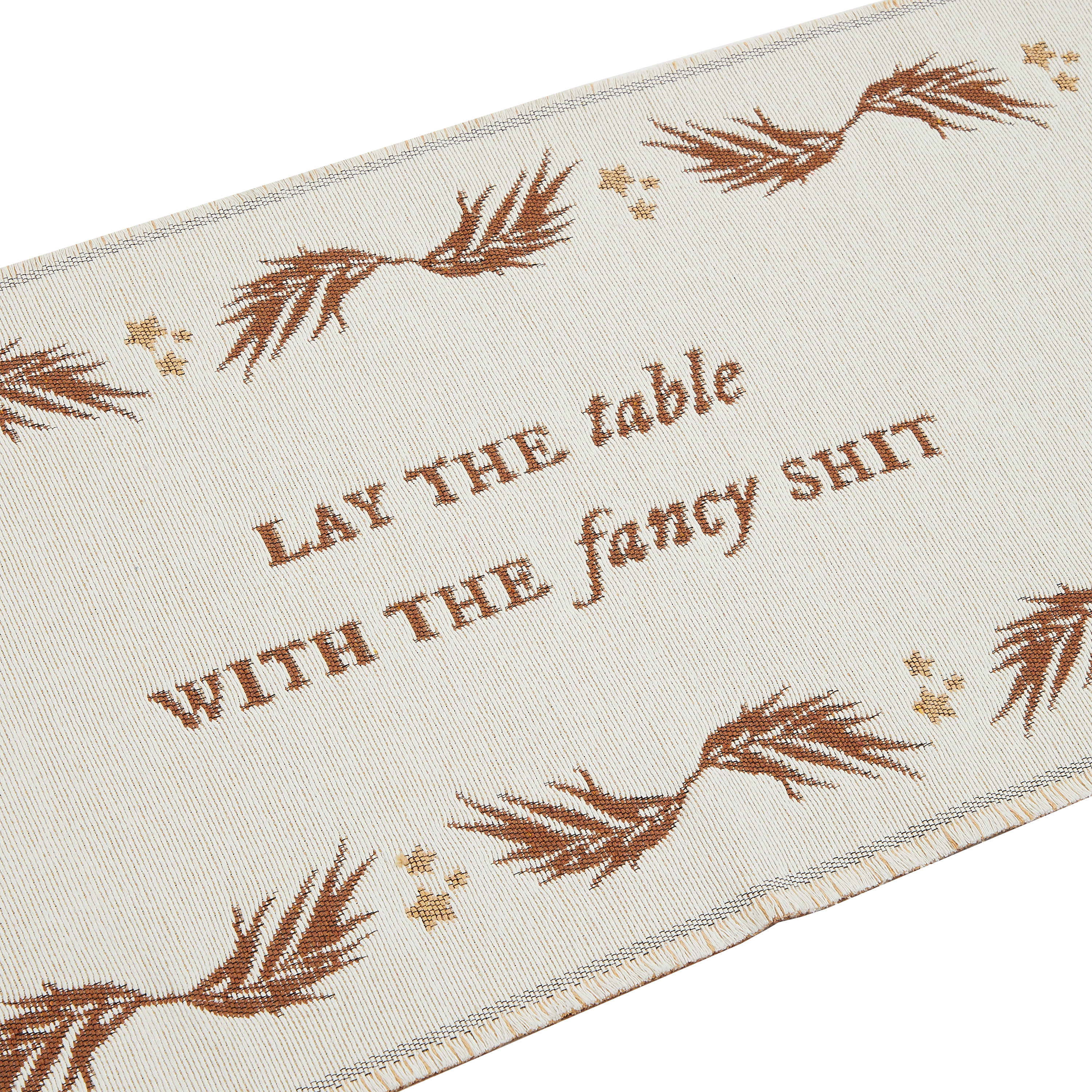 Off white table runner featuring "Lay the table with the fancy shit" song lyrics and leaf and star design knit on front with tassels at each end.