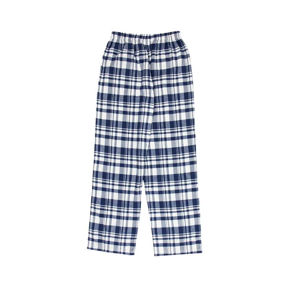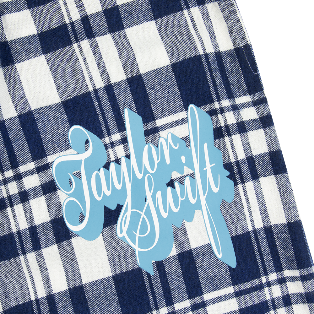 Blue flannel pajama pants featuring "Taylor Swift" printed on the wearer's left leg.
