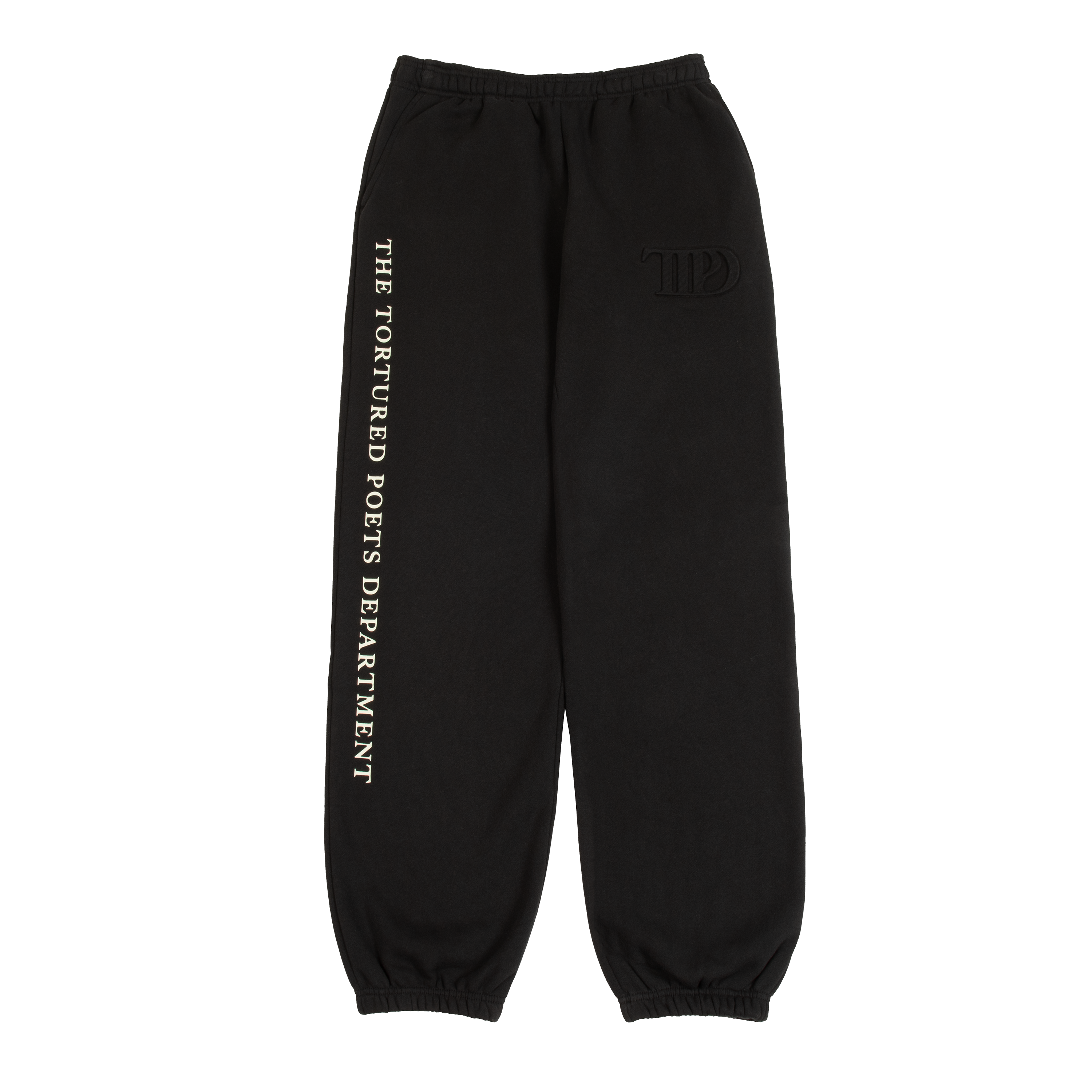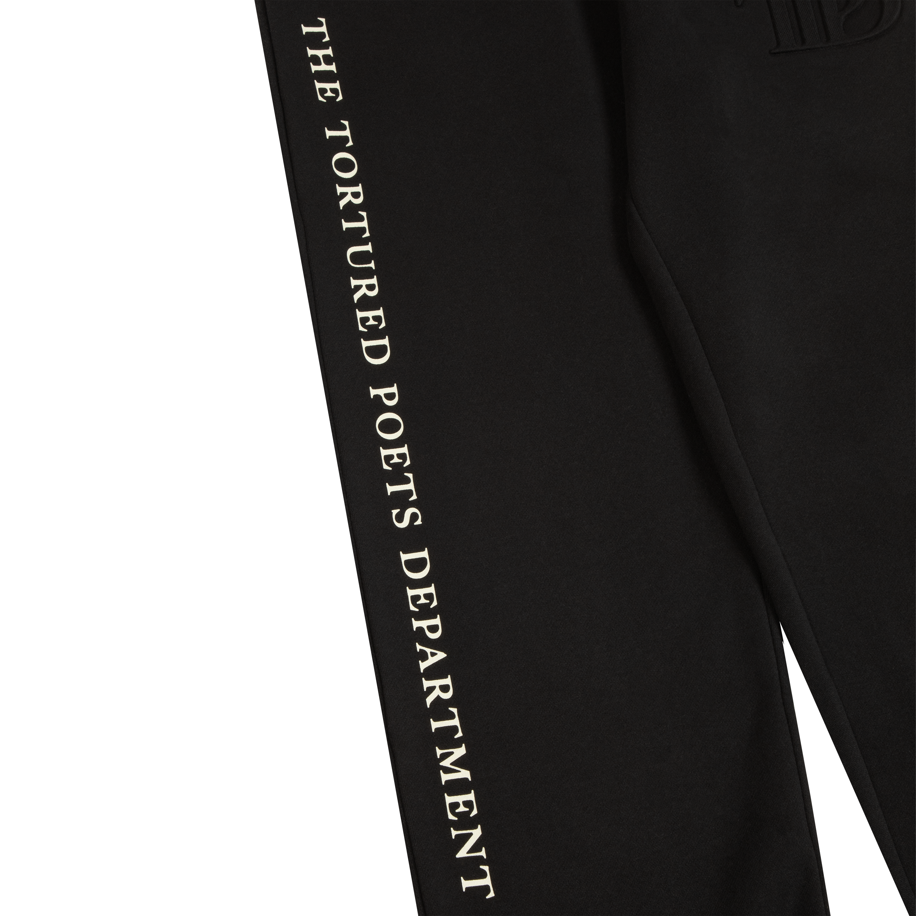 Black sweatpants featuring "TTPD" album logo embossed on wearer's left leg and "The Tortured Poets Department" printed down wearer's right leg. Drawstring waist, and side pockets and back pocket.