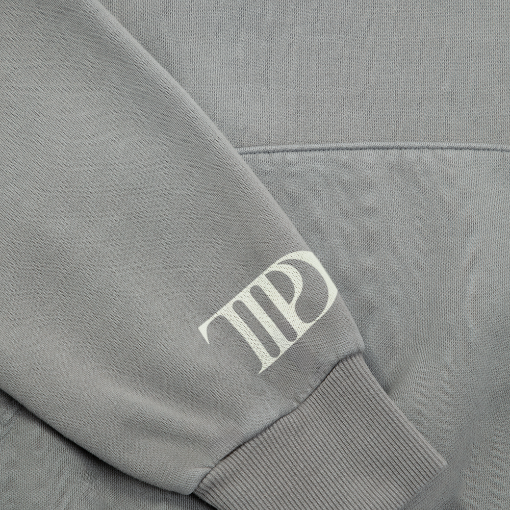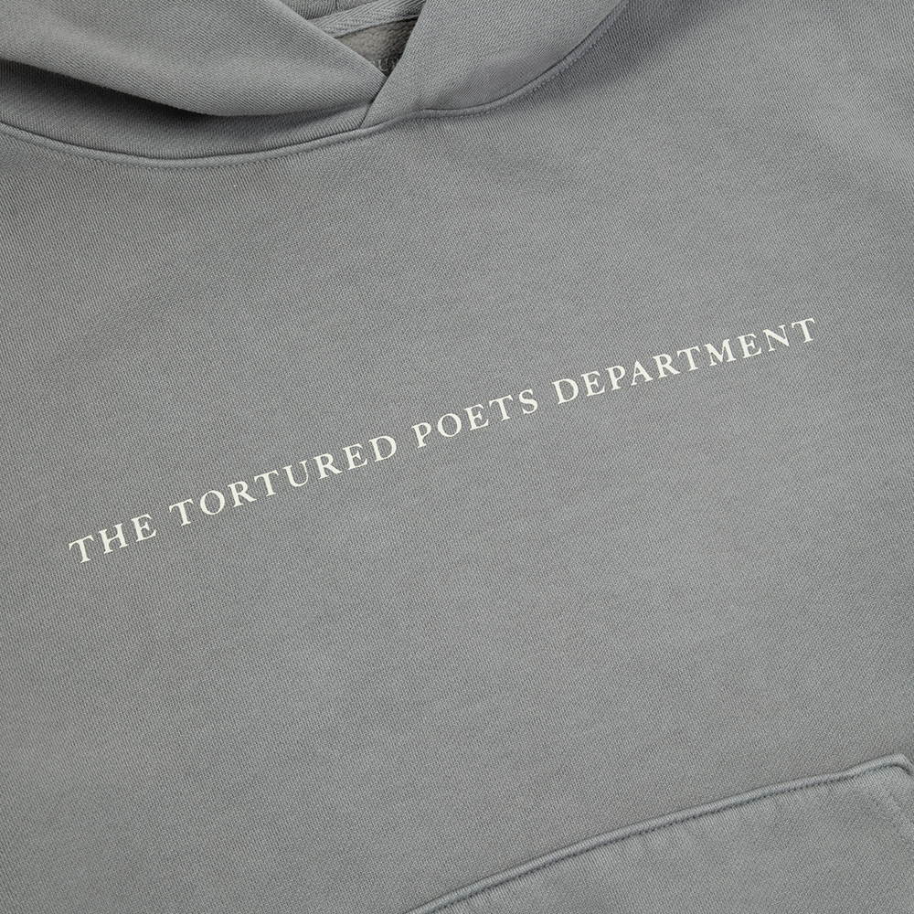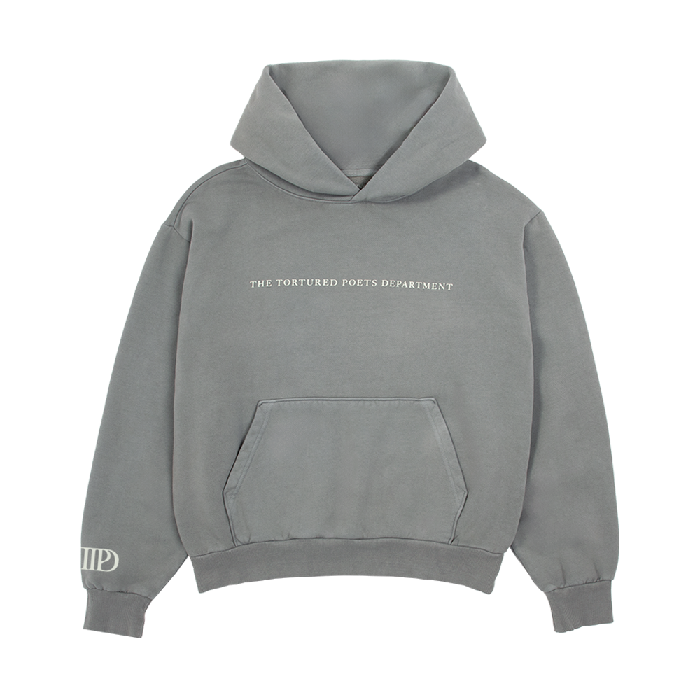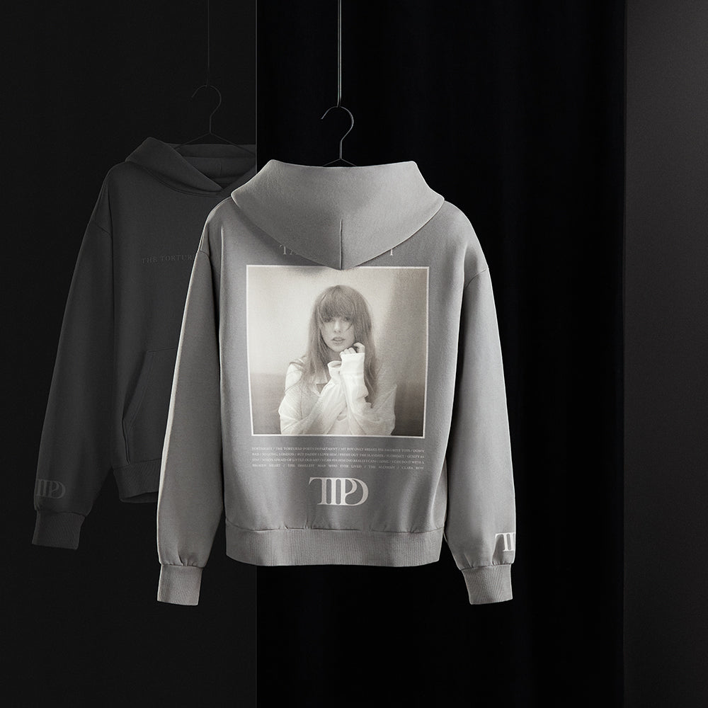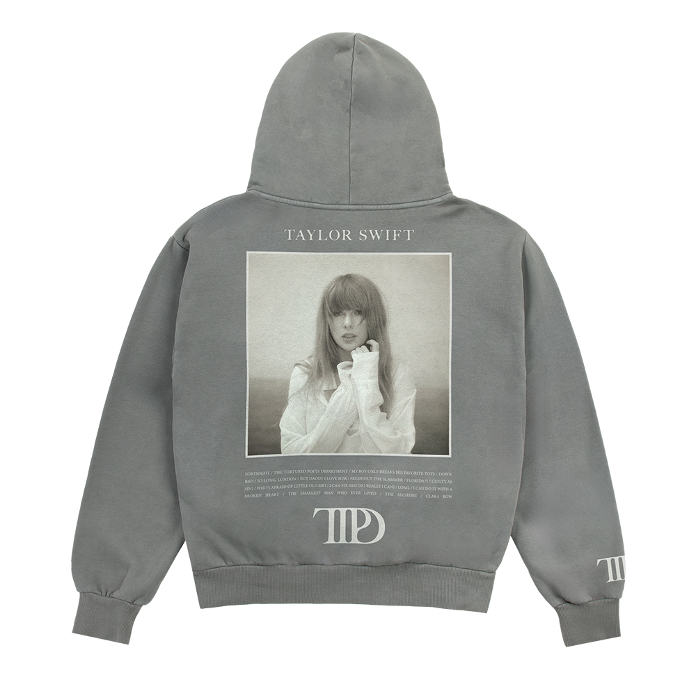 Smoke gray hoodie with front pocket featuring "The Tortured Poets Department" printed on front, "TTPD" album logo printed on wearer's right sleeve, and photo of Taylor Swift, album tracklist, "TTPD" album logo and "Taylor Swift" printed on back.