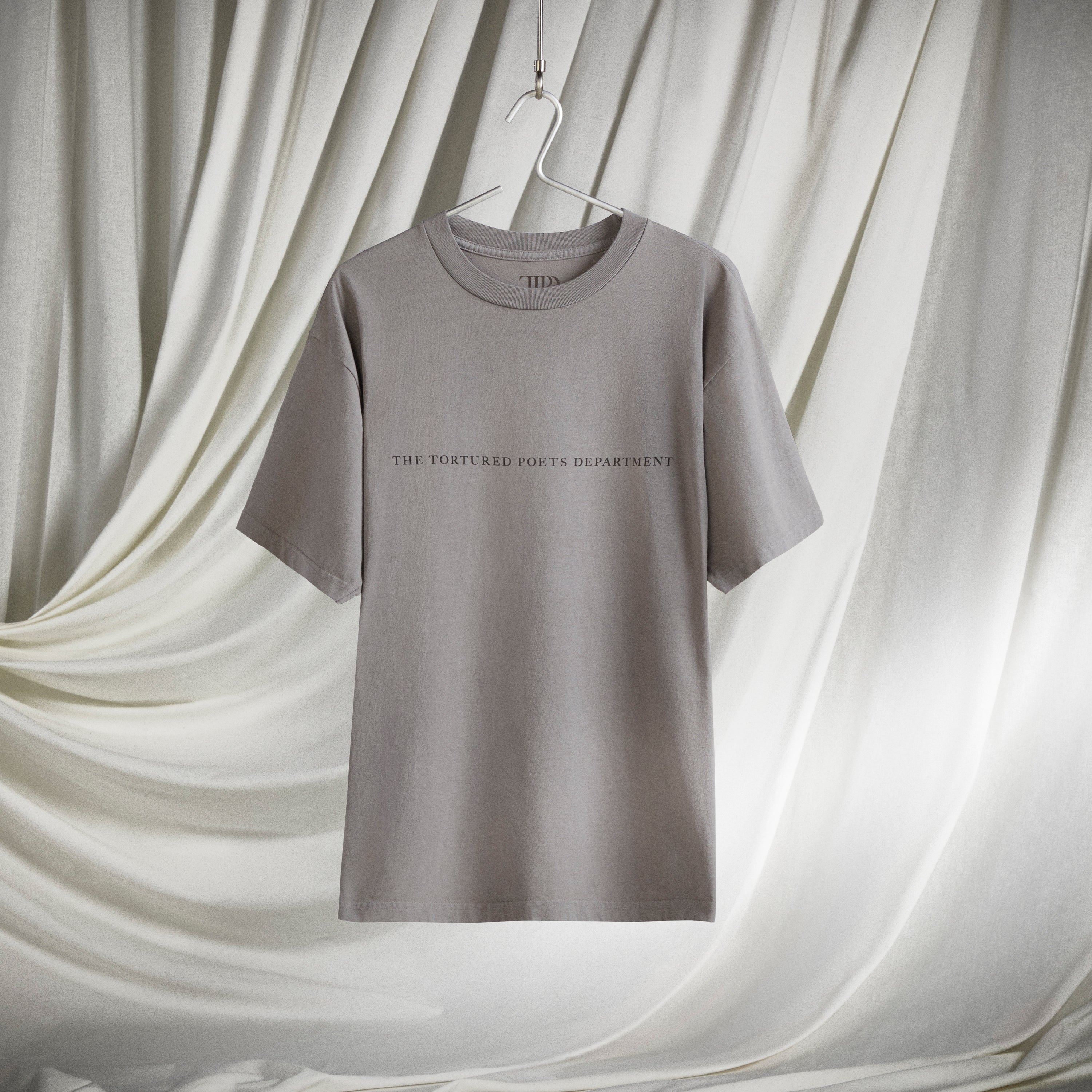 Gray t-shirt featuring "The Tortured Poets Department" printed on front with heart and sword design, "I Can Do It With A Broken Heart" song lyrics, "TTPD" album Logo, "The Tortured Poets Department", and "Lights, Camera, Bitch Smile" song lyrics printed on back.