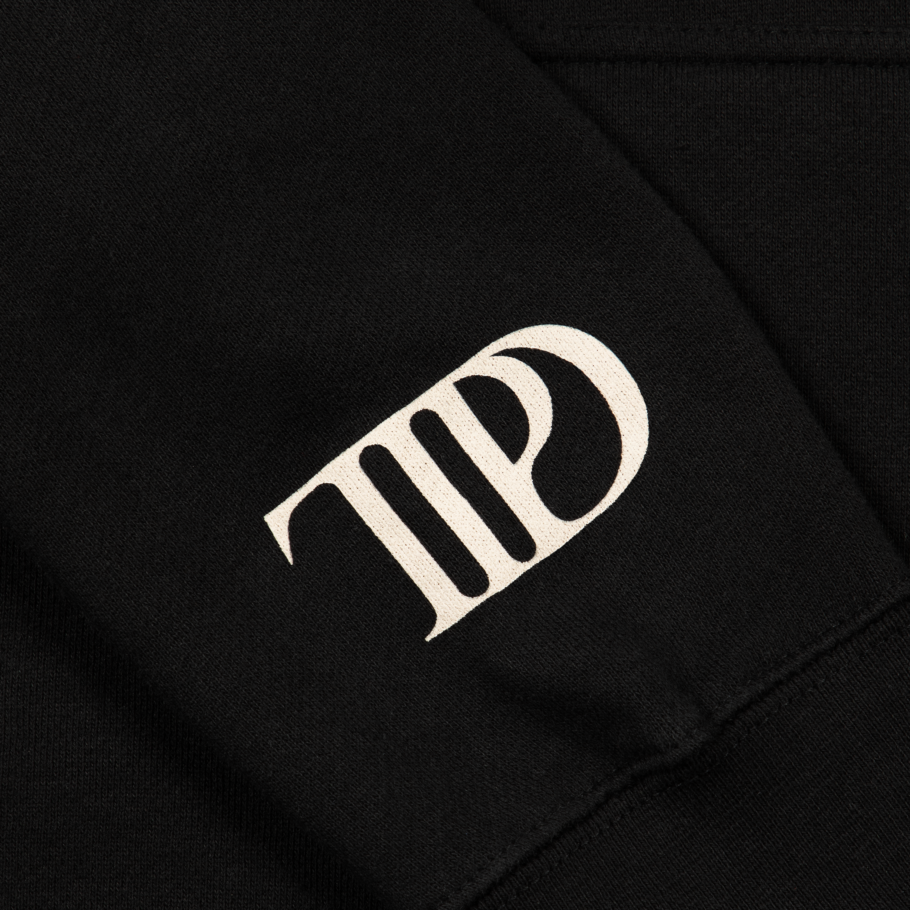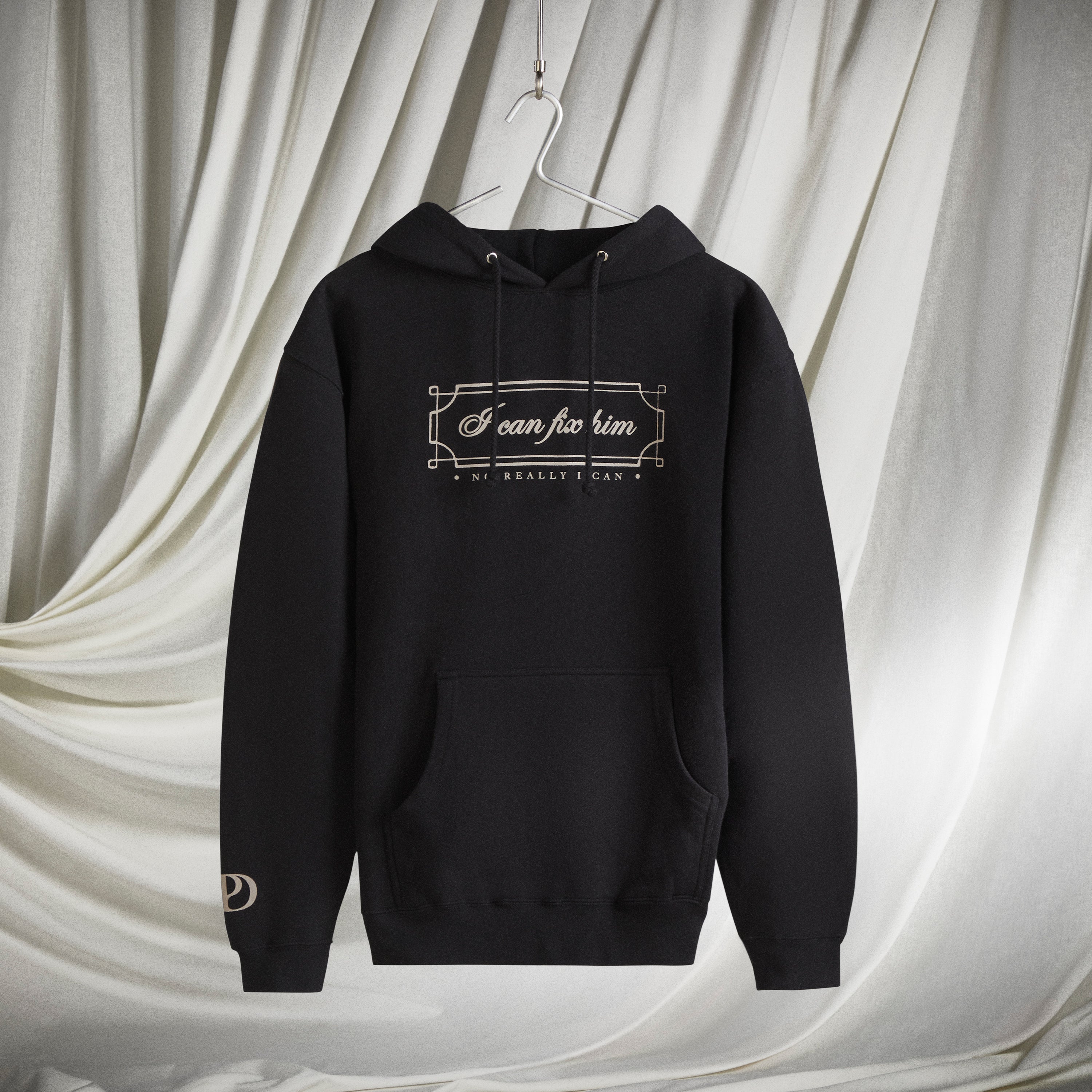 Black hoodie with front pocket featuring double line box design with "I Can Fix Him No I Really Can" song lyrics printed on front and "TTPD" album logo on wearer's right sleeve.