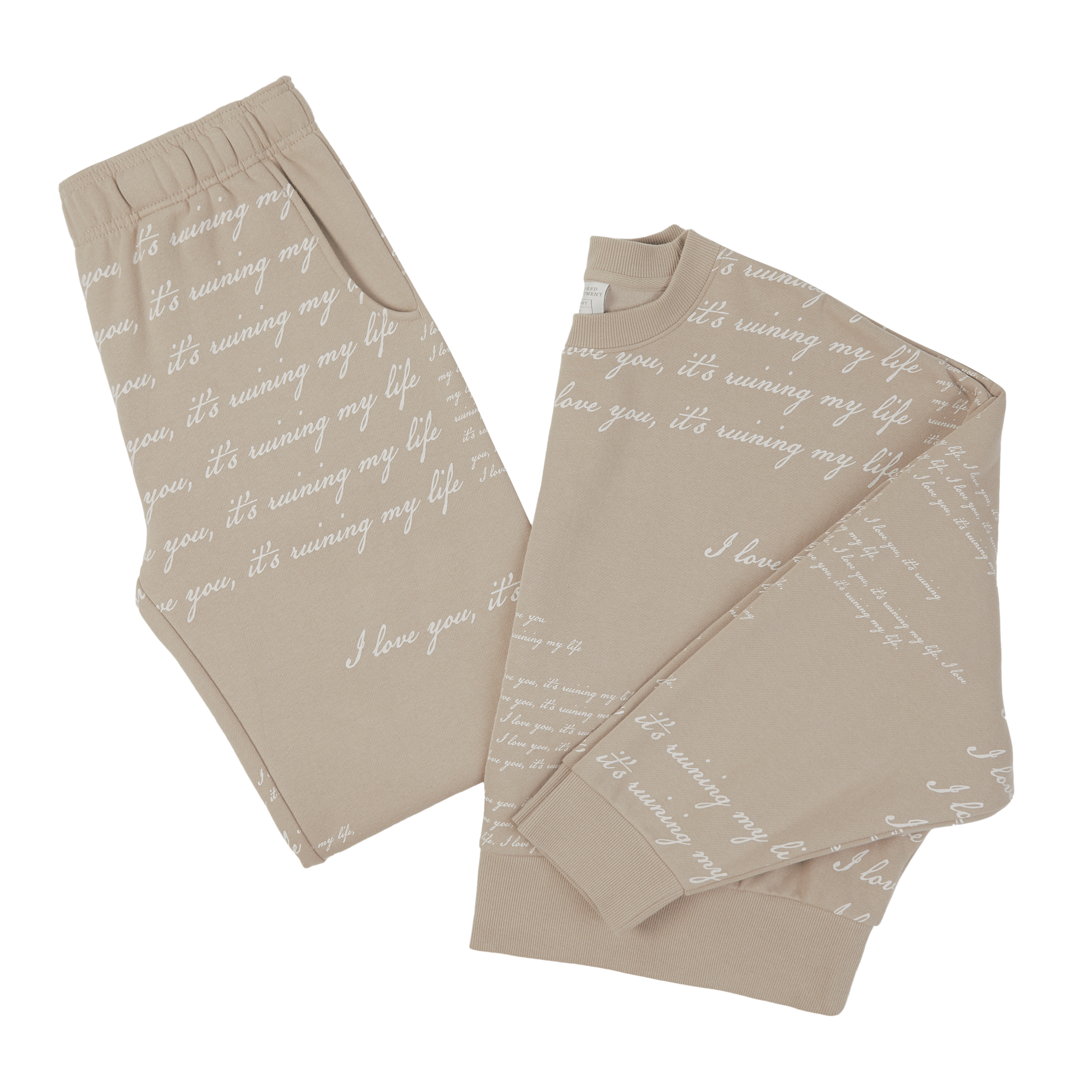 Beige boxy crewneck featuring "I Love You, It's Ruining My Life" song lyrics all over print.