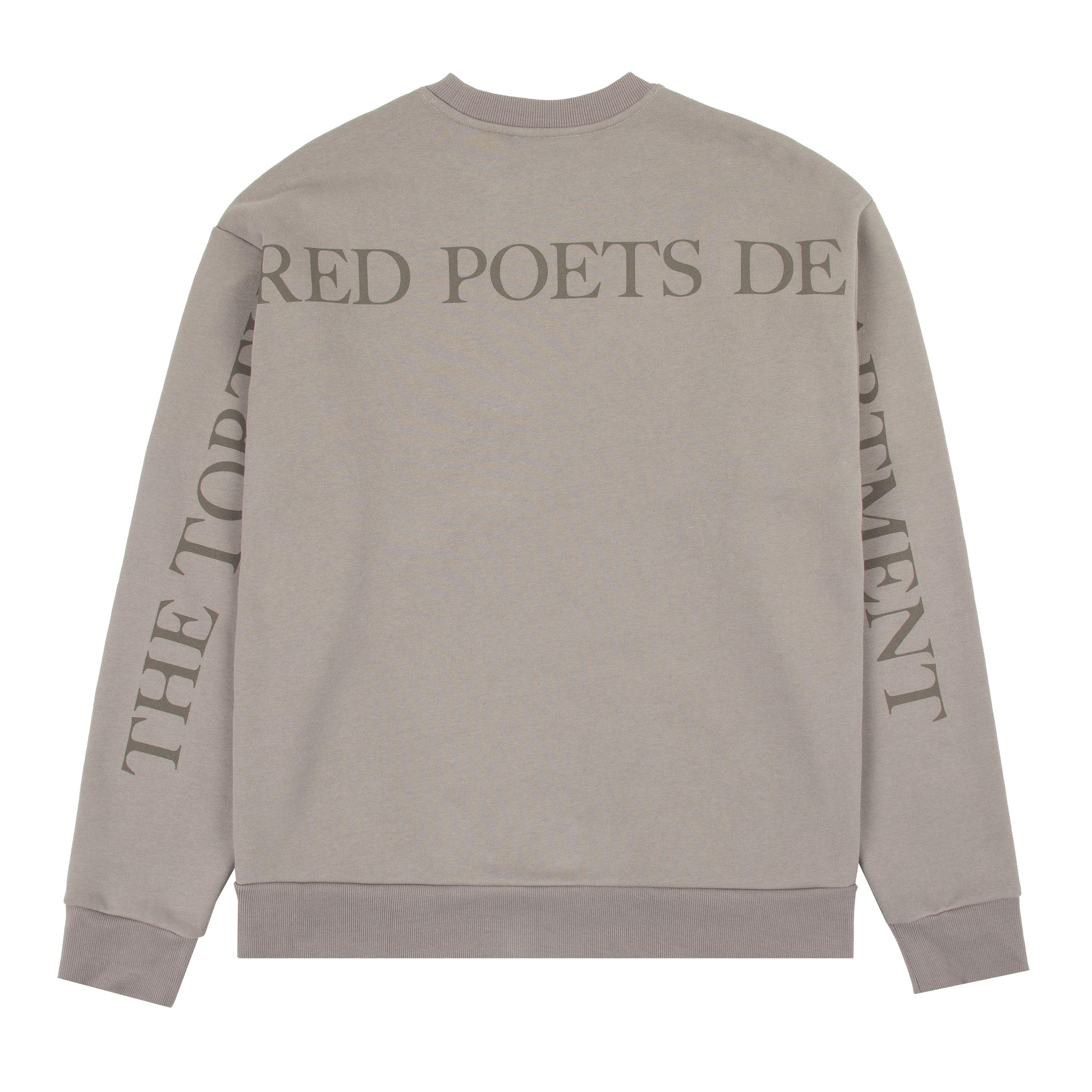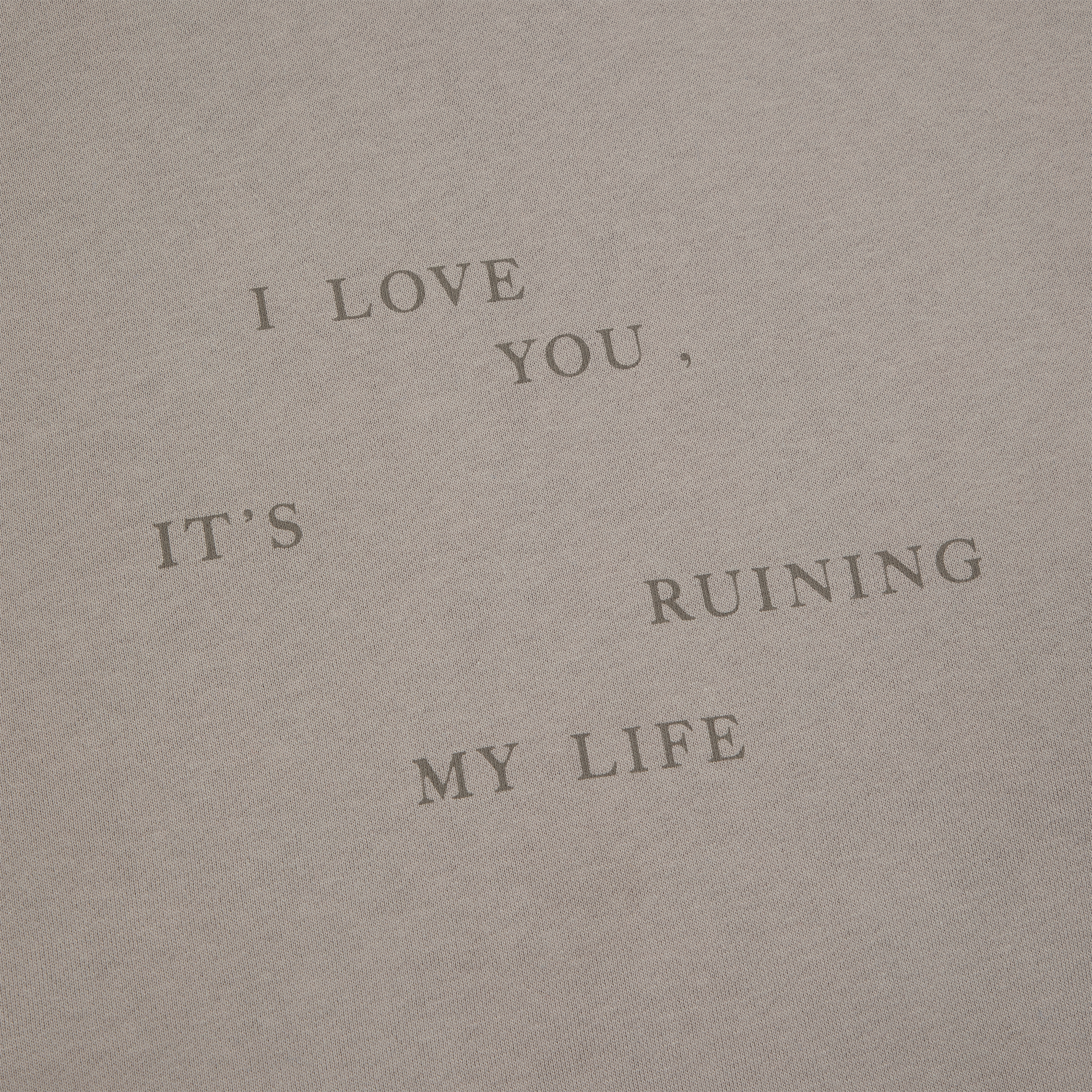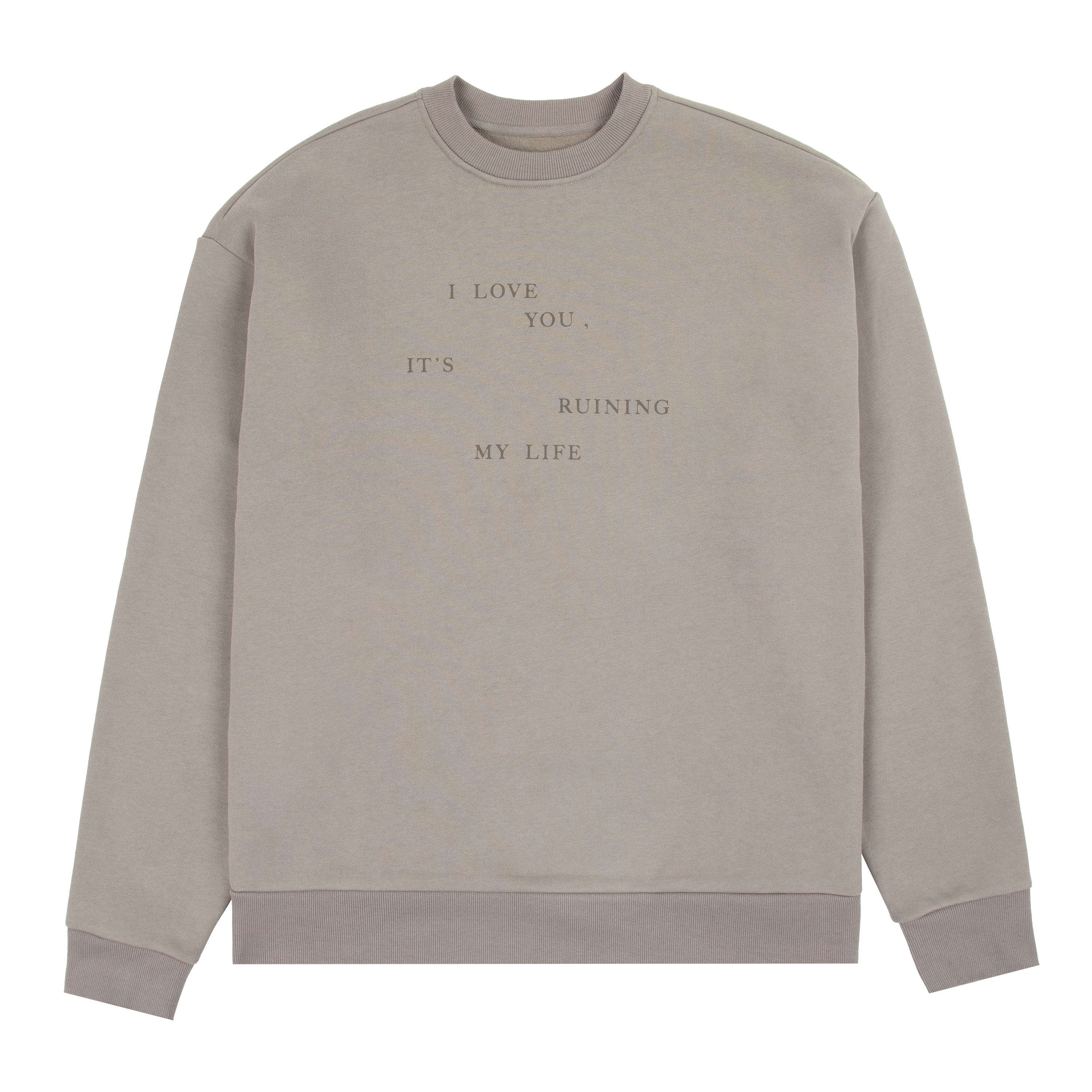 Gray crewneck featuring "I Love You It's Ruining My Life" song lyrics printed on front with "The Tortured Poets Department" printed on back and down both sleeves.