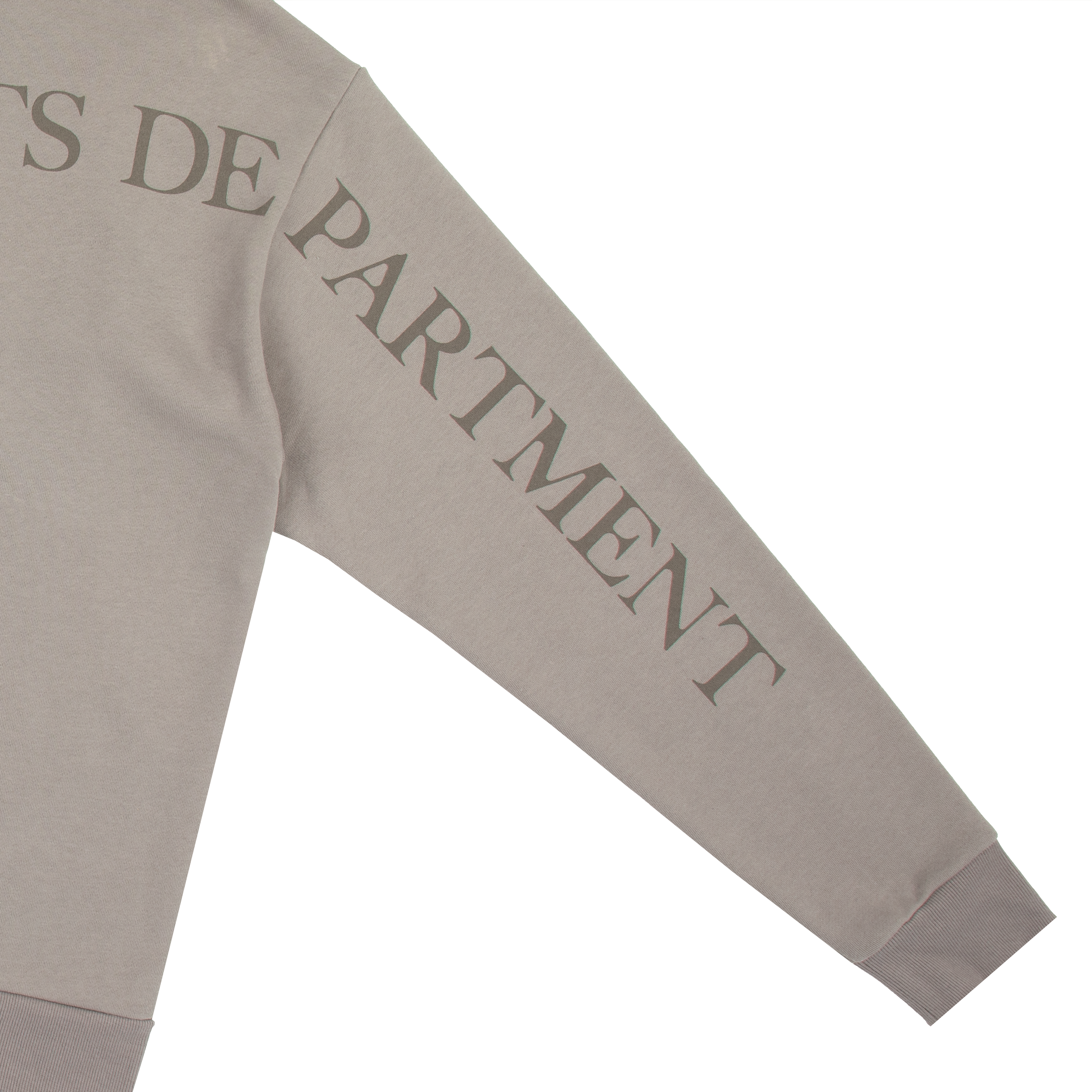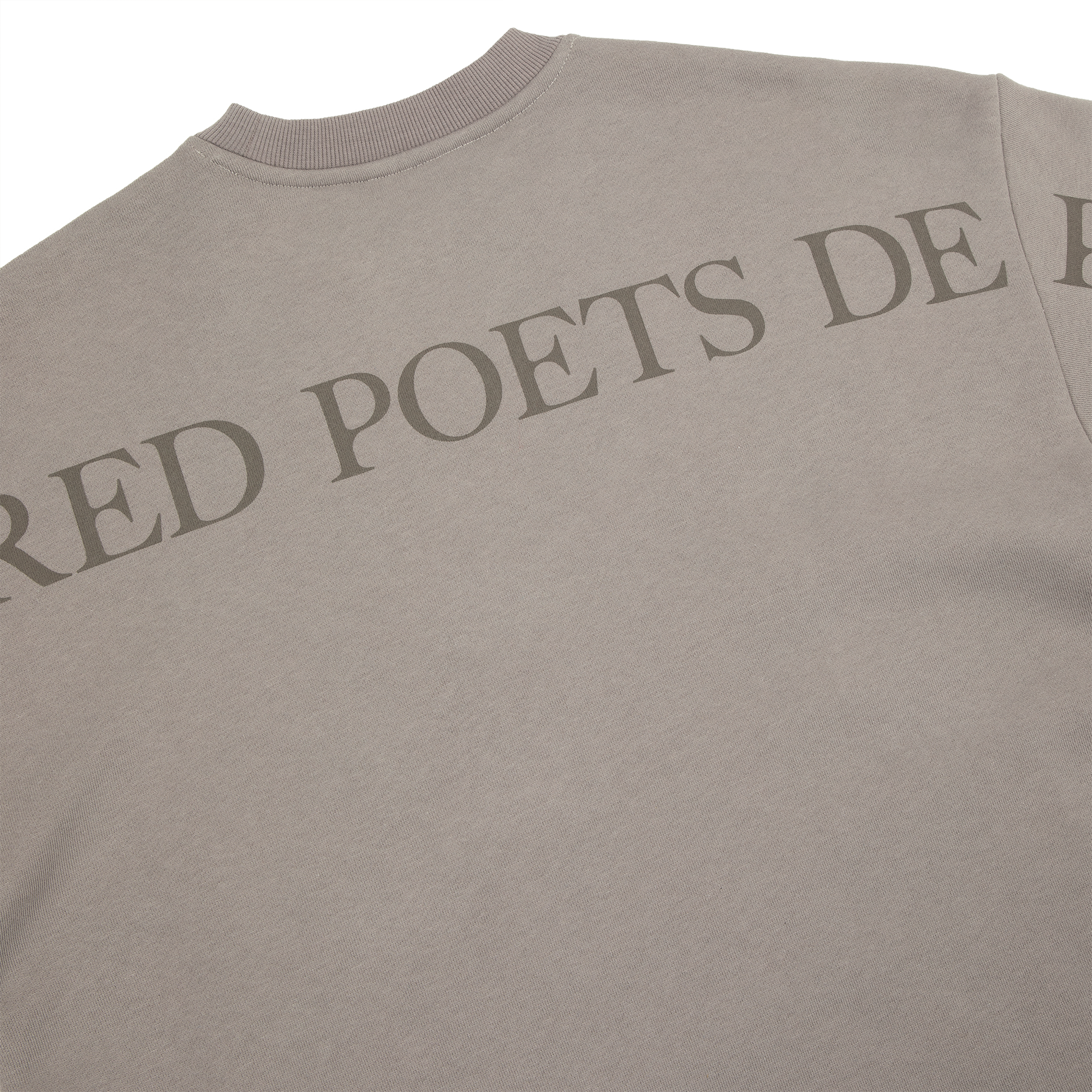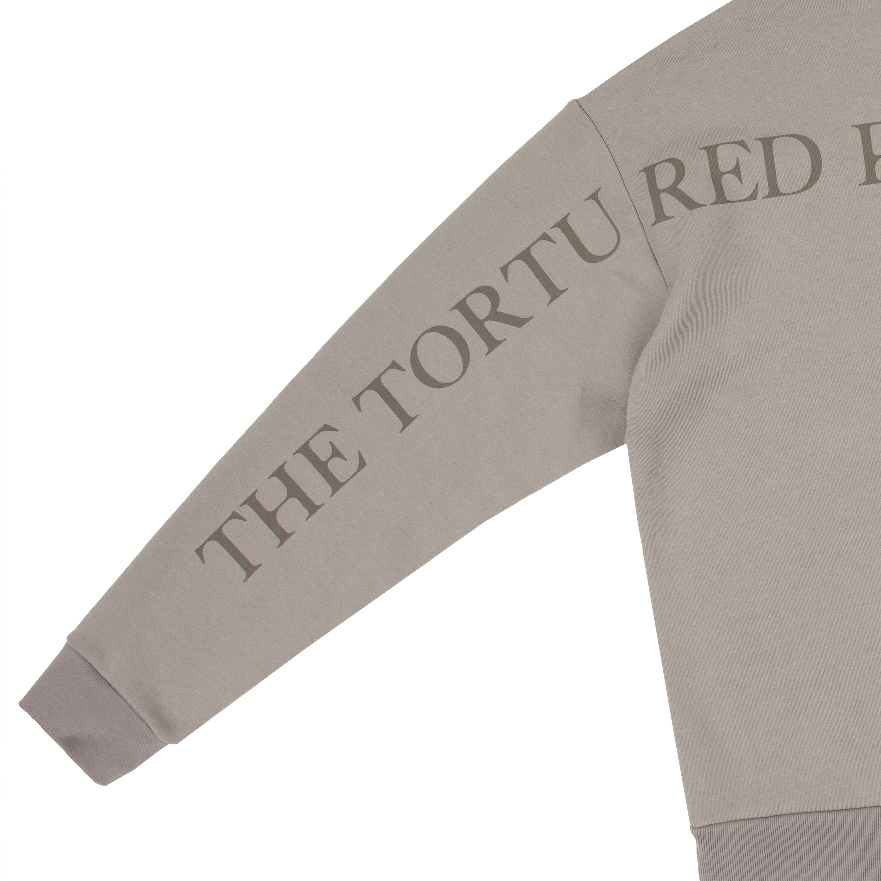 Gray crewneck featuring "I Love You It's Ruining My Life" song lyrics printed on front with "The Tortured Poets Department" printed on back and down both sleeves.