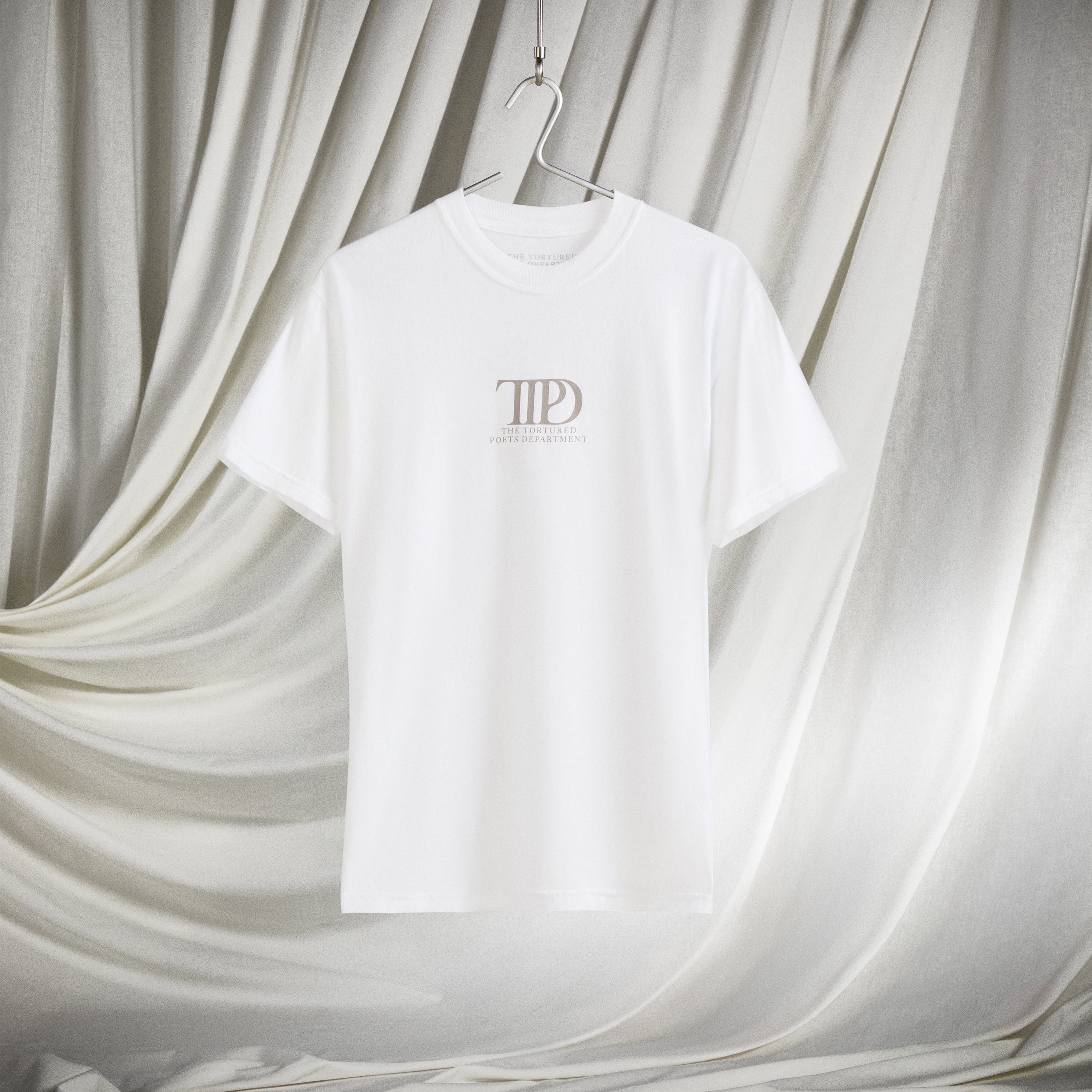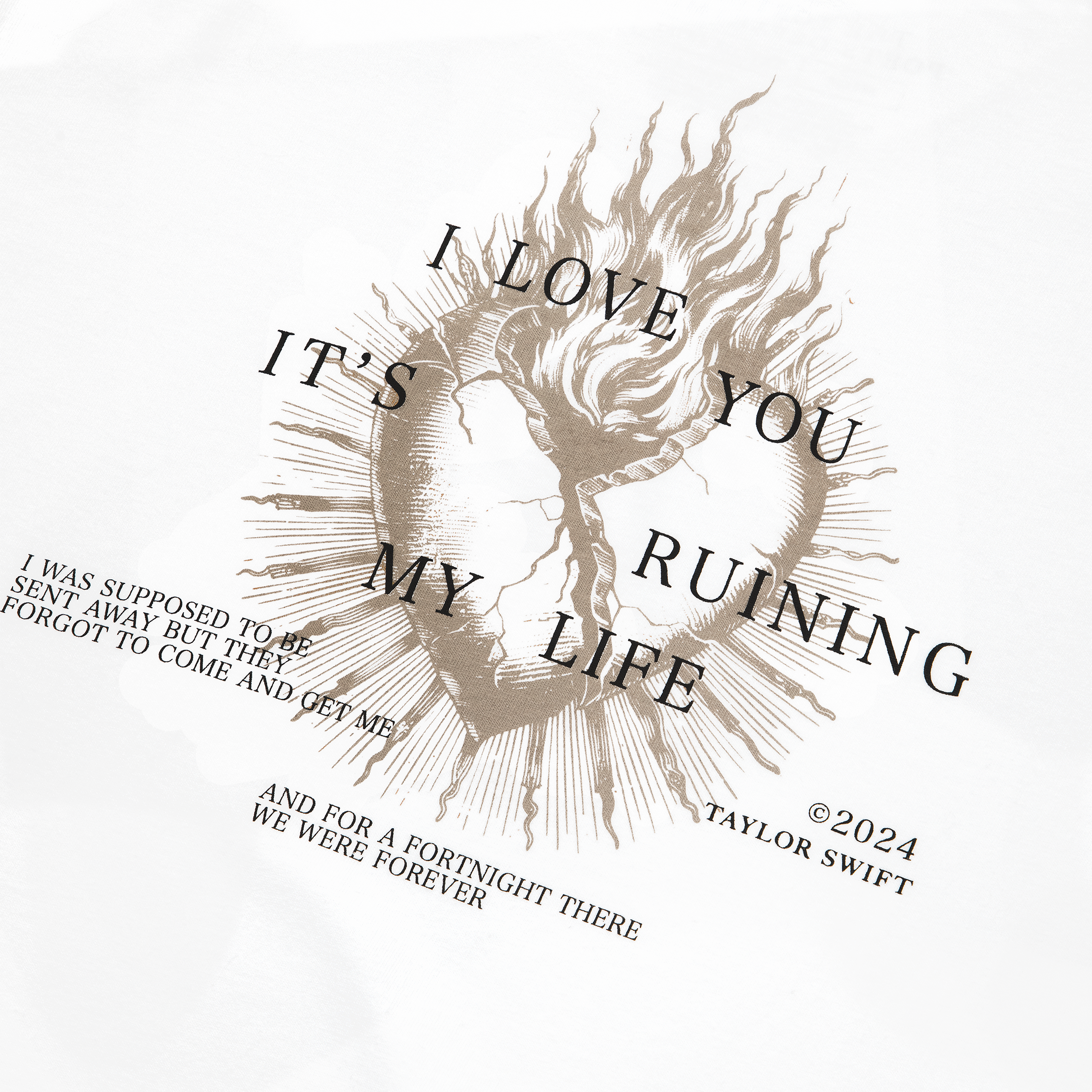 White t-shirt featuring "TTPD" album logo and "The Tortured Poets Department" printed on front with a heart and flames design, "I Love You It's Ruining My Life" song lyrics, "I Was Supposed To Be Sent Away But They Forgot To Come And Get Me" song lyrics, "And For A Fortnight There We Were Forever" song lyrics, and "©2024 Taylor Swift" printed on back.