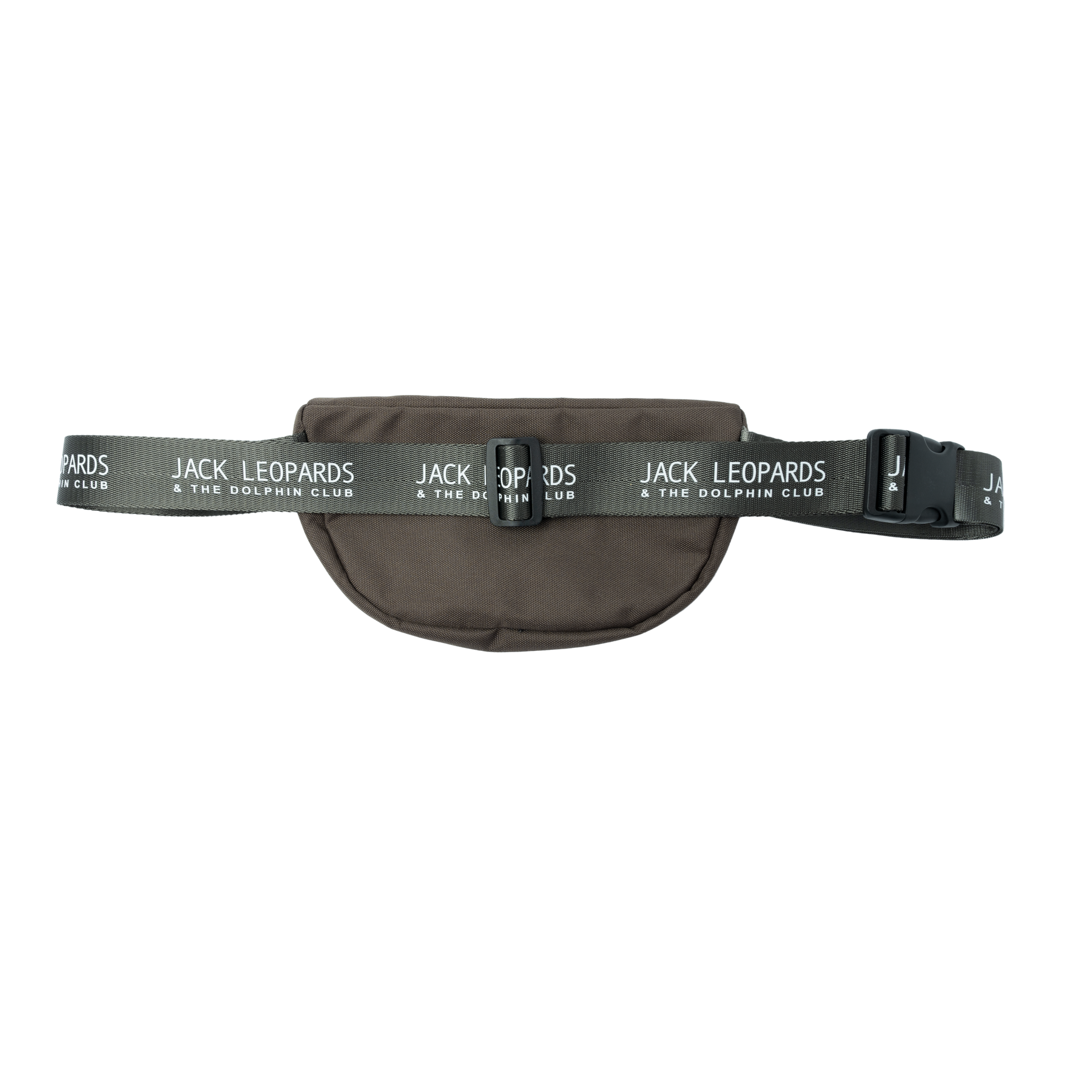 Brown zipper hip bag featuring "Jack Leopards & The Dolphin Club" embroidered on front woven label with "Jack Leopards & The Dolphin Club" repeating logo printed on adjustable strap with buckle closure.