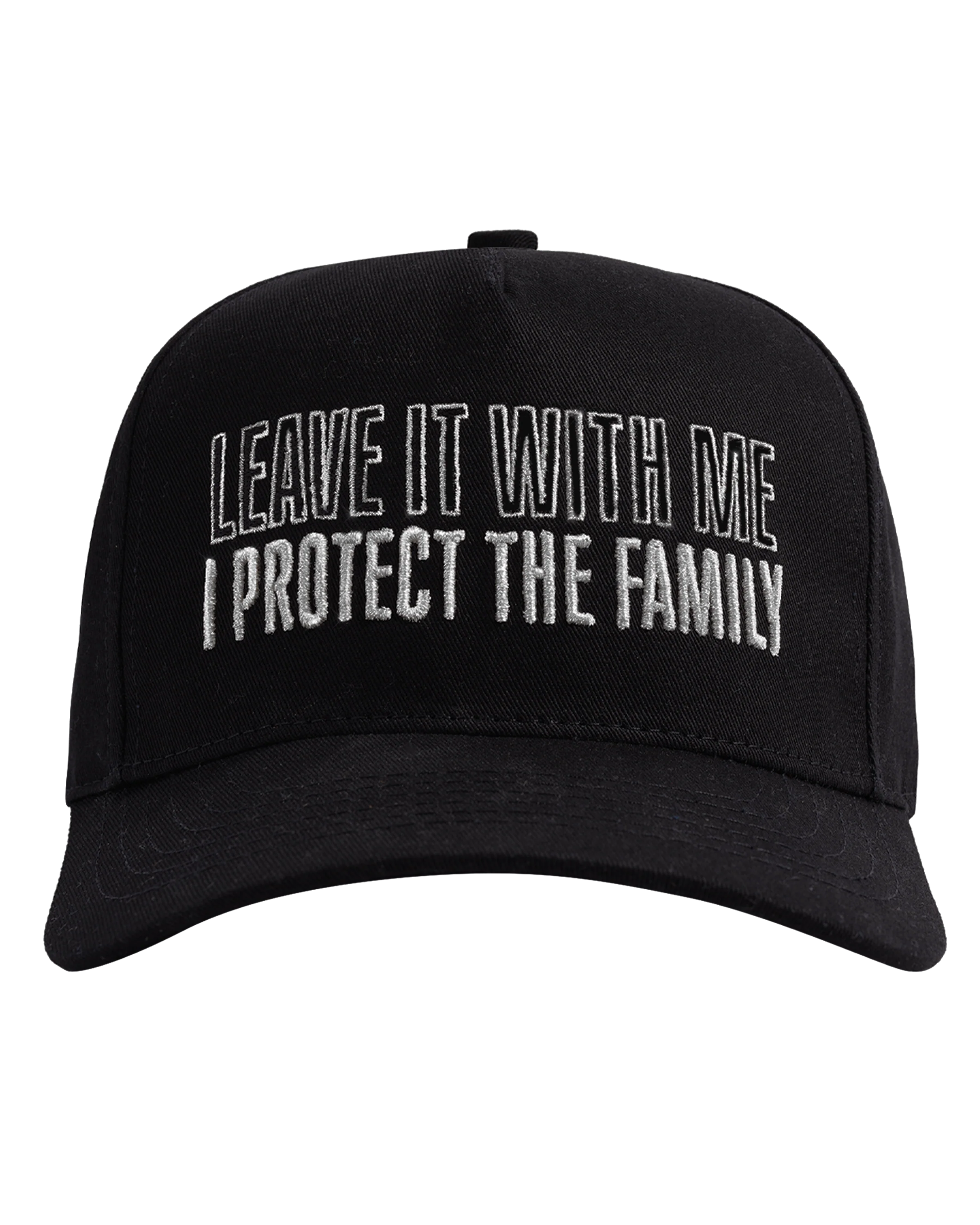 BLACK HAT FEATURING "LEAVE IT WITH ME I PROTECT THE FAMILY" SONG LYRICS IN SILVER LUREX EMBROIDERY ON FRONT AND "T.S." LOGO IN SILVER LUREX EMBROIDERY ON WEARER'S LEFT SIDE. SNAP BACK CLOSURE.