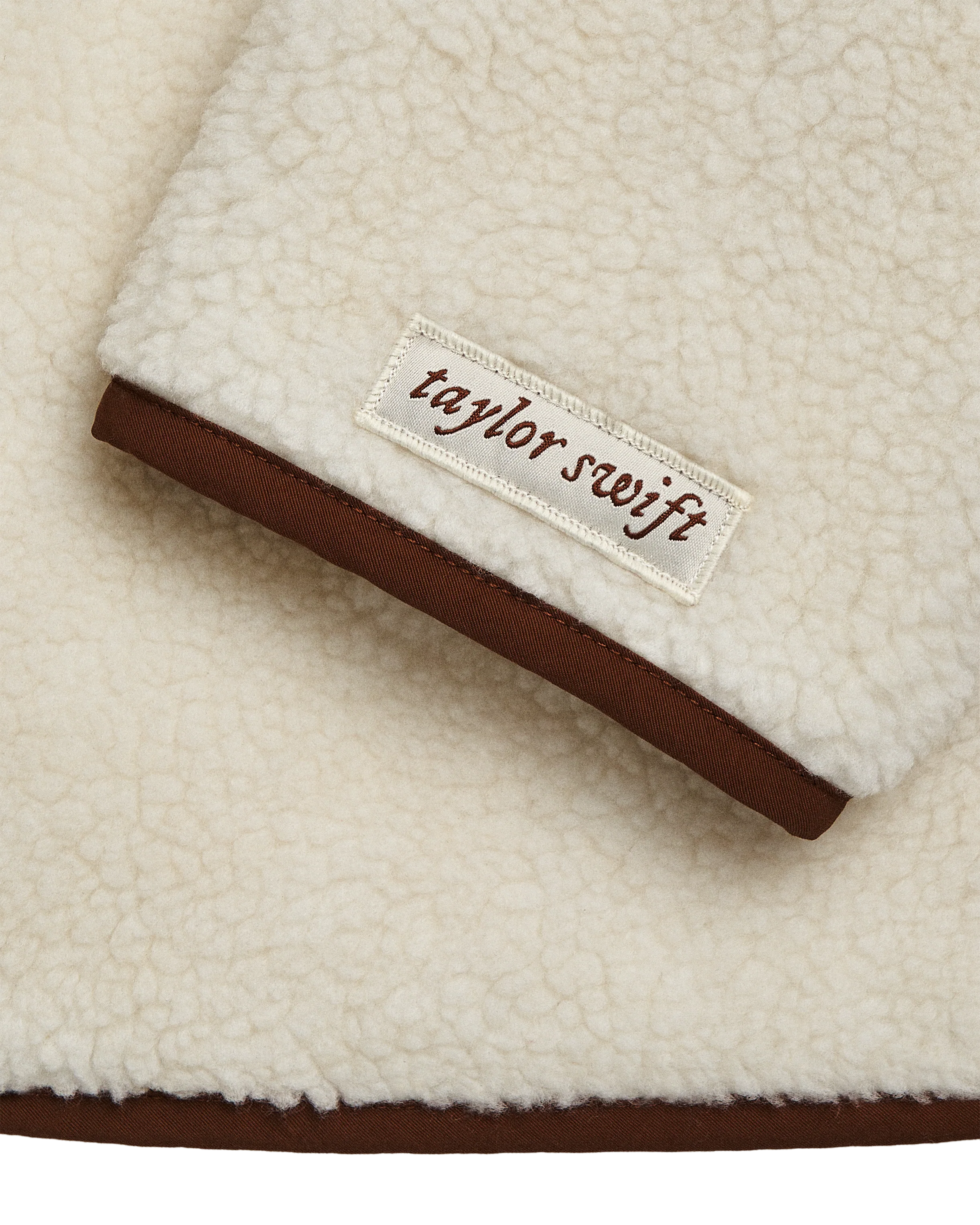 Cream sherpa zip up fleece with waist pockets featuring zip pocket on wearer's left front chest, brown contrast binding with "taylor swift" logo woven label on wearer's left sleeve, and willow branch design embroidered on front and down both sleeves.