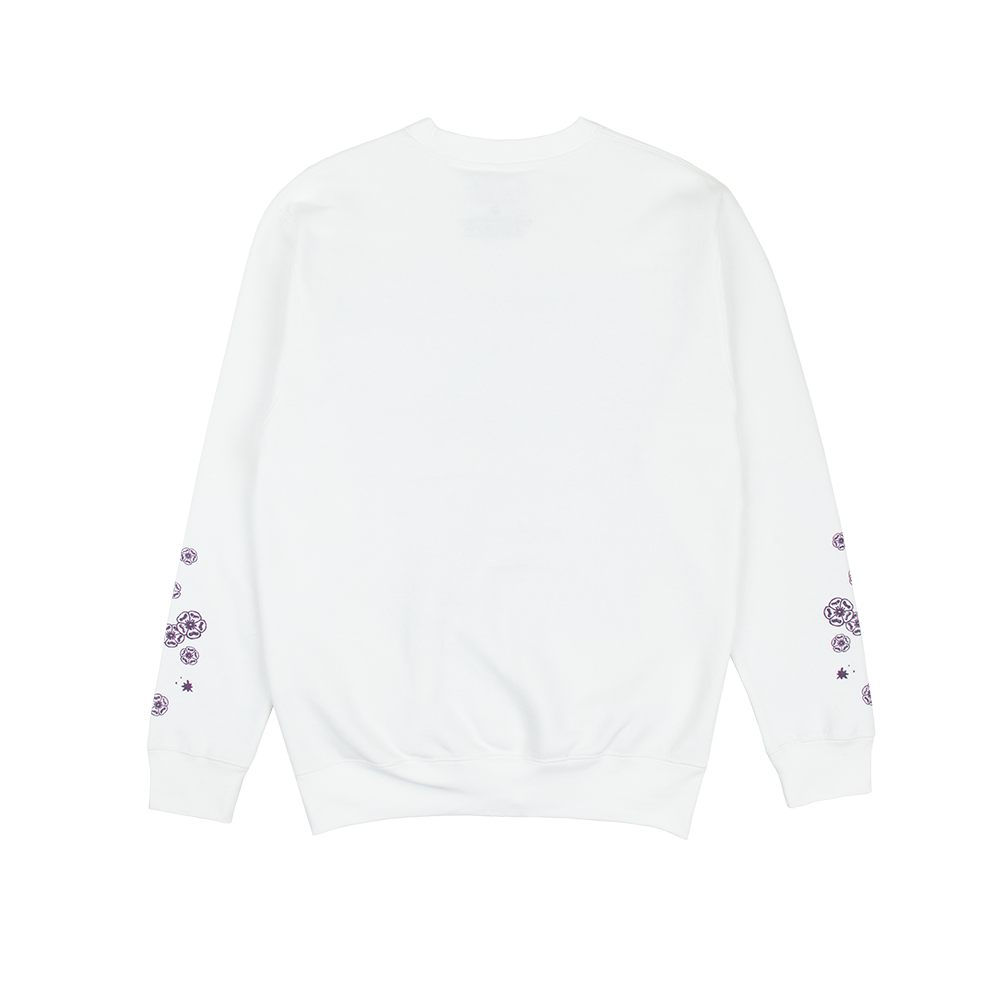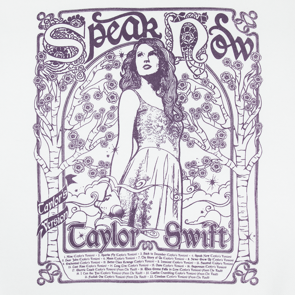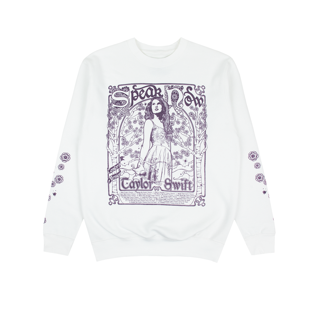 White crewneck featuring illustration of Taylor Swift and tree design with "Speak Now Taylor's Version", "Taylor Swift", and Speak Now Taylor's Version tracklist printed on front with flower design printed on sleeves.