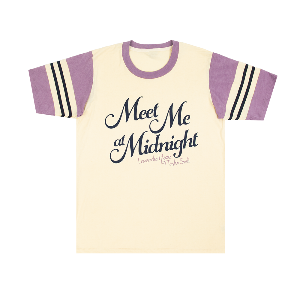 White and purple ringer t-shirt featuring the words "Meet Me At Midnight" and "Lavender Haze by Taylor Swift" printed on front.