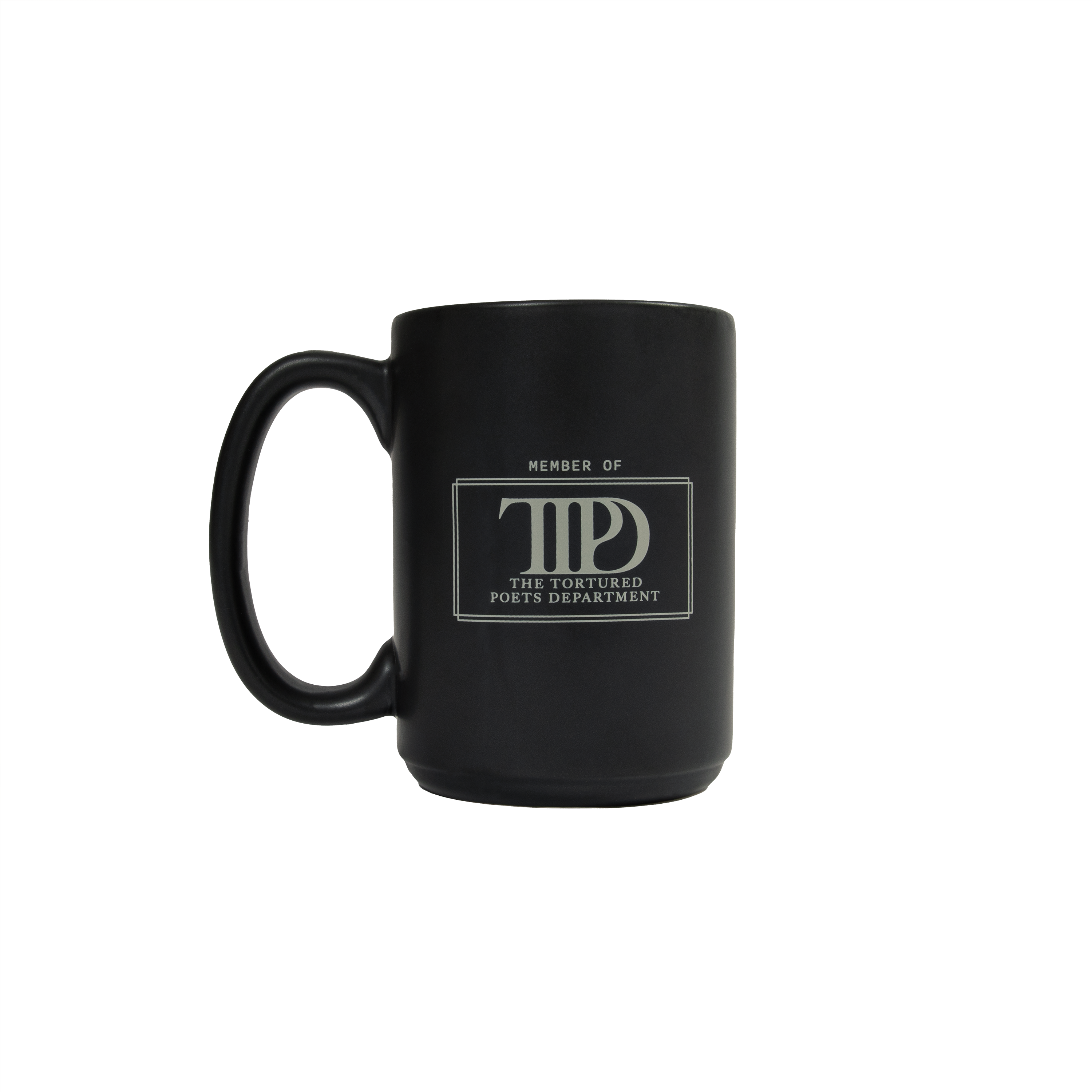 Black mug featuring double line design, "Member of", "TTPD" album logo, and "The Tortured Poets Department" printed on front with "Taylor Swift" printed on back with box design.