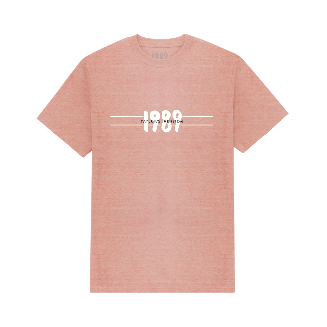 Pink t-shirt featuring stripes across front chest and "1989 Taylor's Version" printed on front.