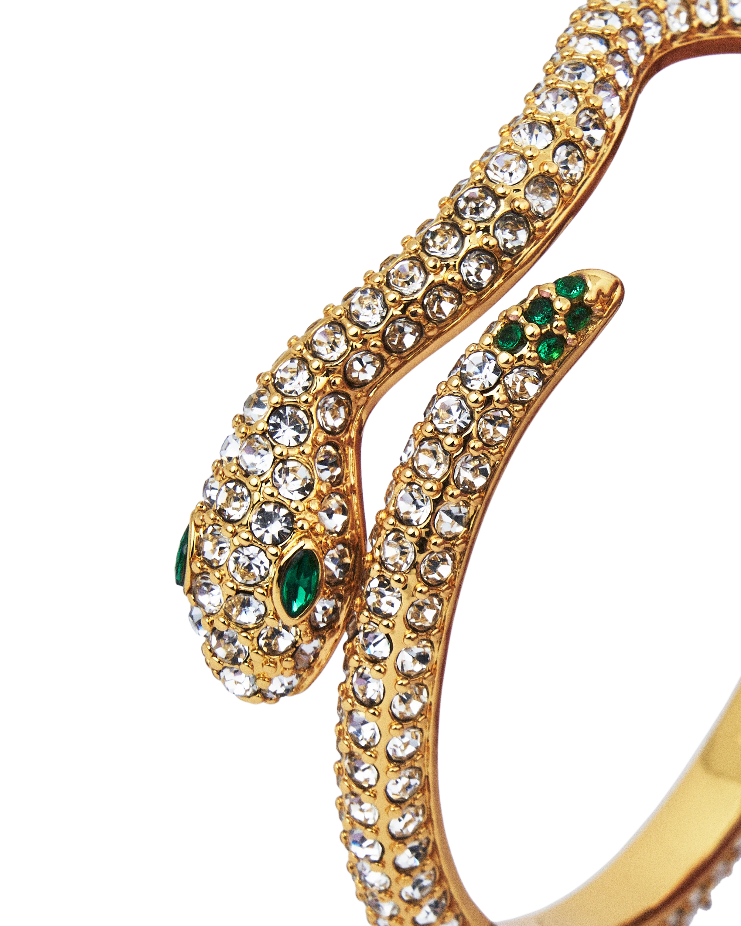 Gold tone rhinestone encrusted snake cuff bracelet featuring hinge closure with "TS" logo and "reputation" album logo engraved along the inside.