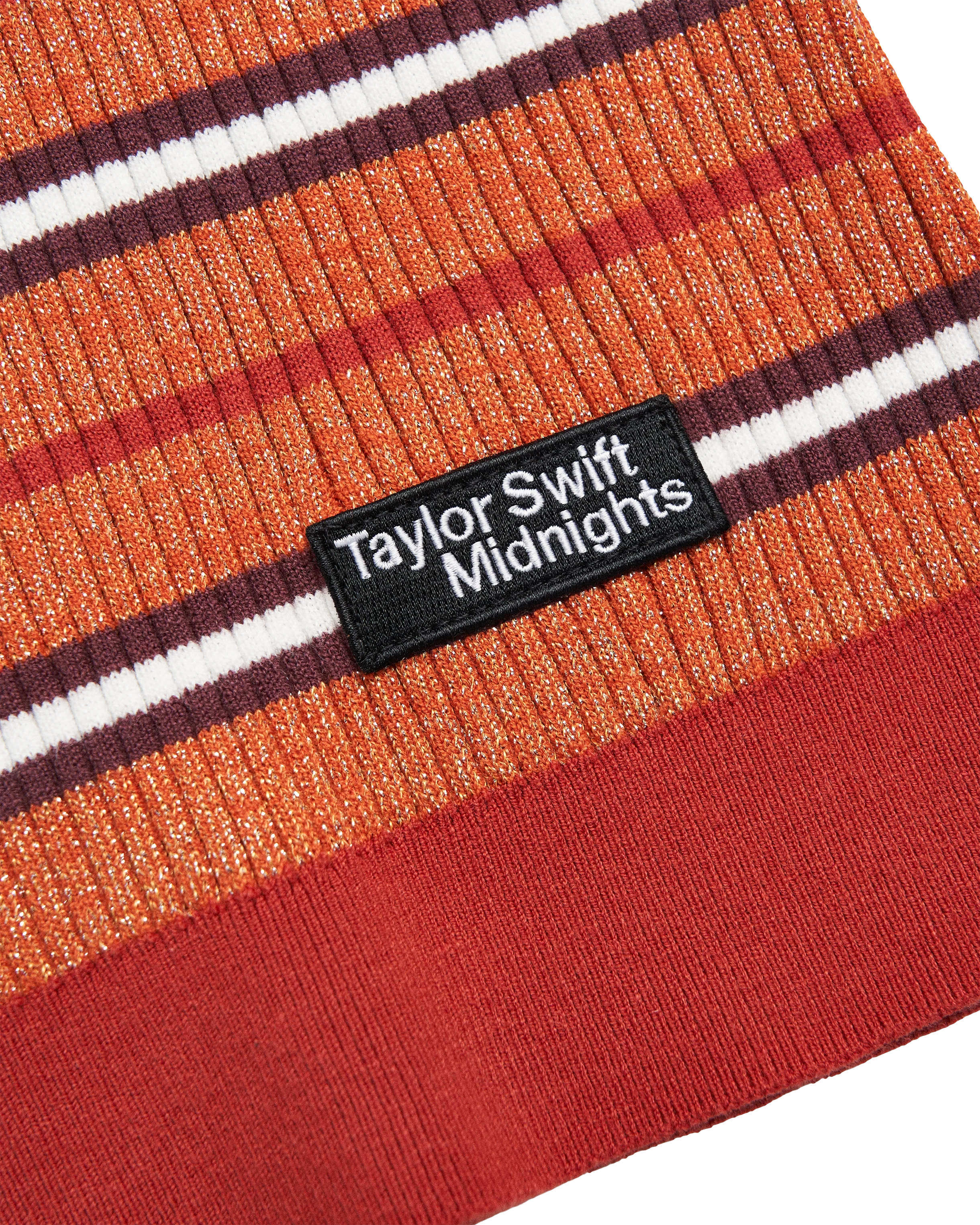 Orange and maroon multi-stripe polo top with three buttons featuring "Taylor Swift Midnights" patch embroidered on wearer's left hem.