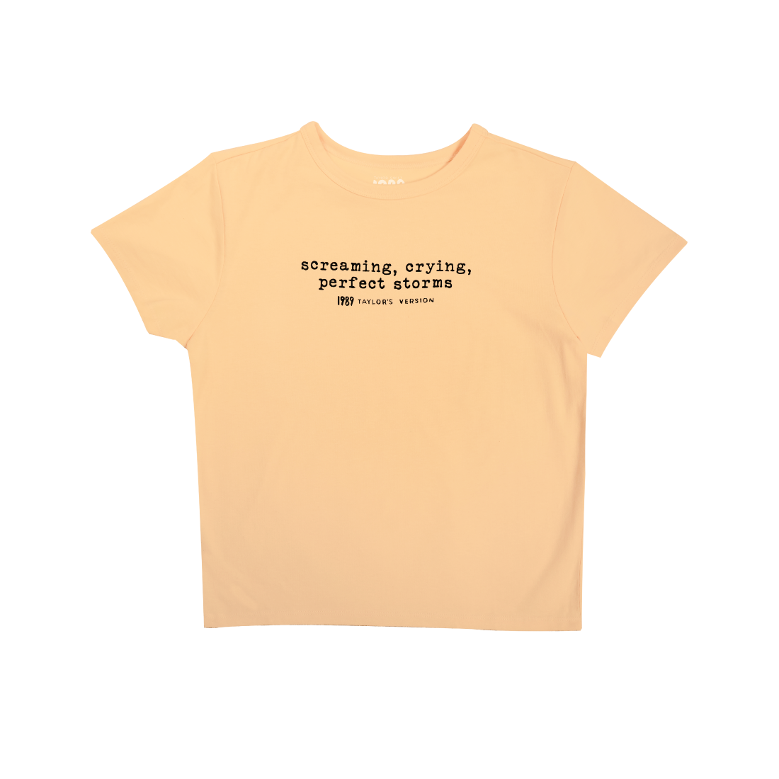 Yellow baby t-shirt featuring the words "screaming, crying, perfect storms" and "1989 Taylor's Version" printed on front.