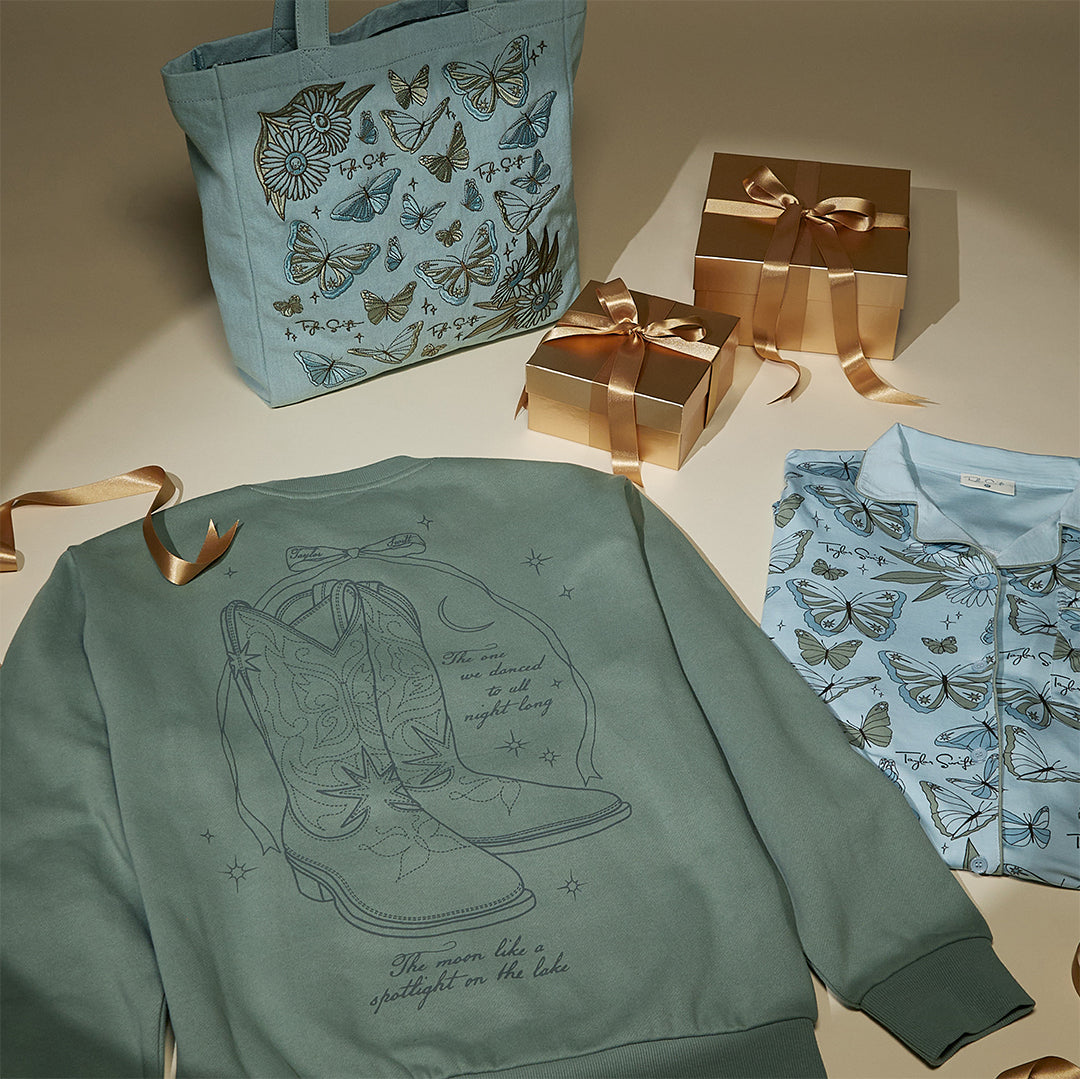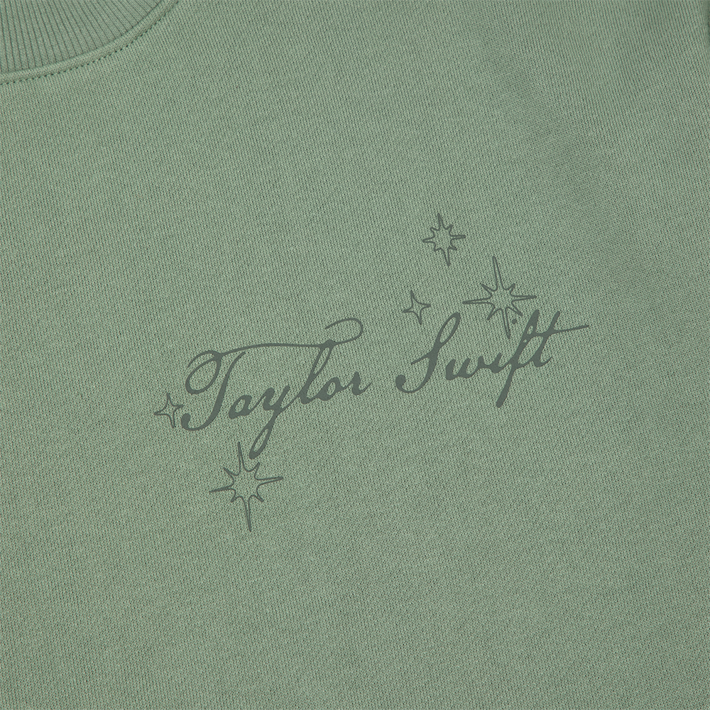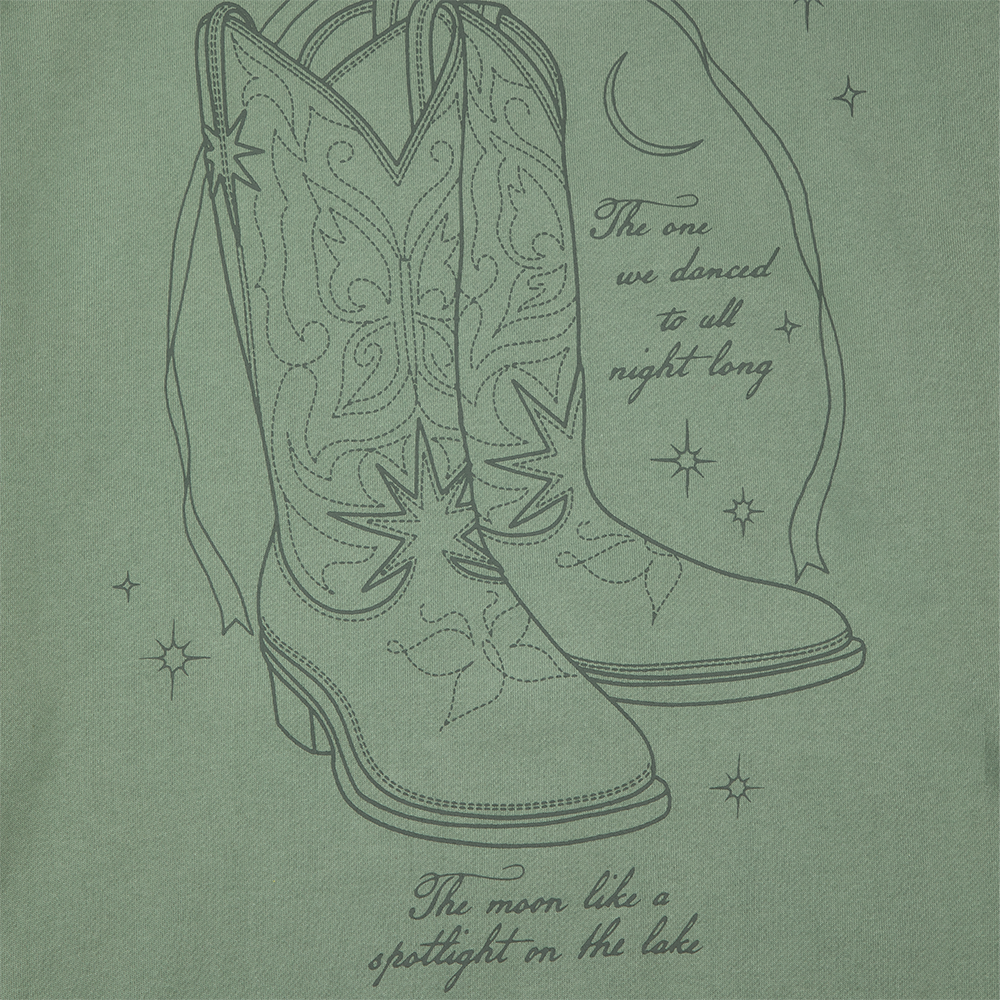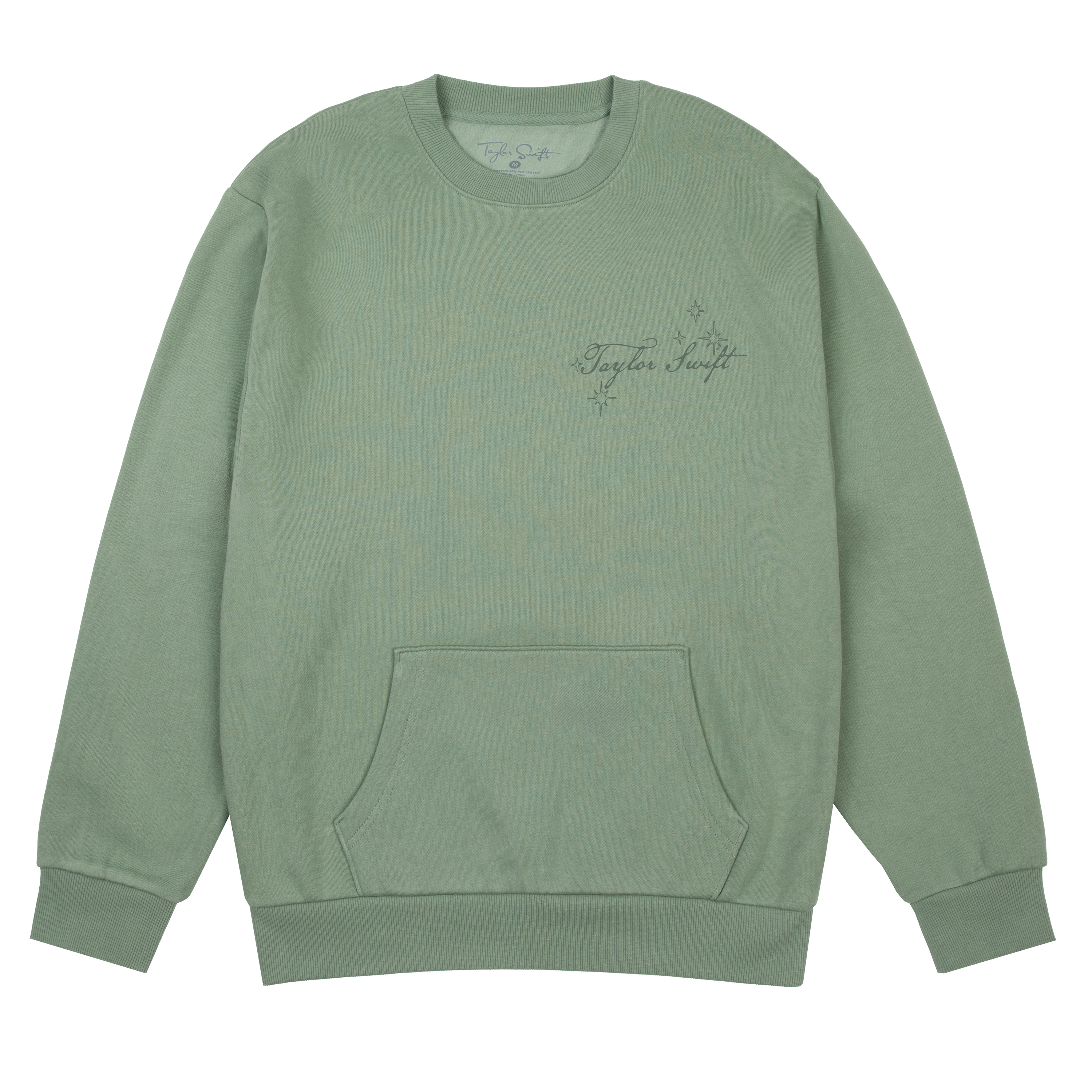 Green kanga pocket crewneck featuring "Taylor Swift" with star design printed on wearer's front left chest and "The one we danced to all night long", "The moon like a spotlight on the lake" song lyrics with cowboy boot, ribbon and star design printed on back.