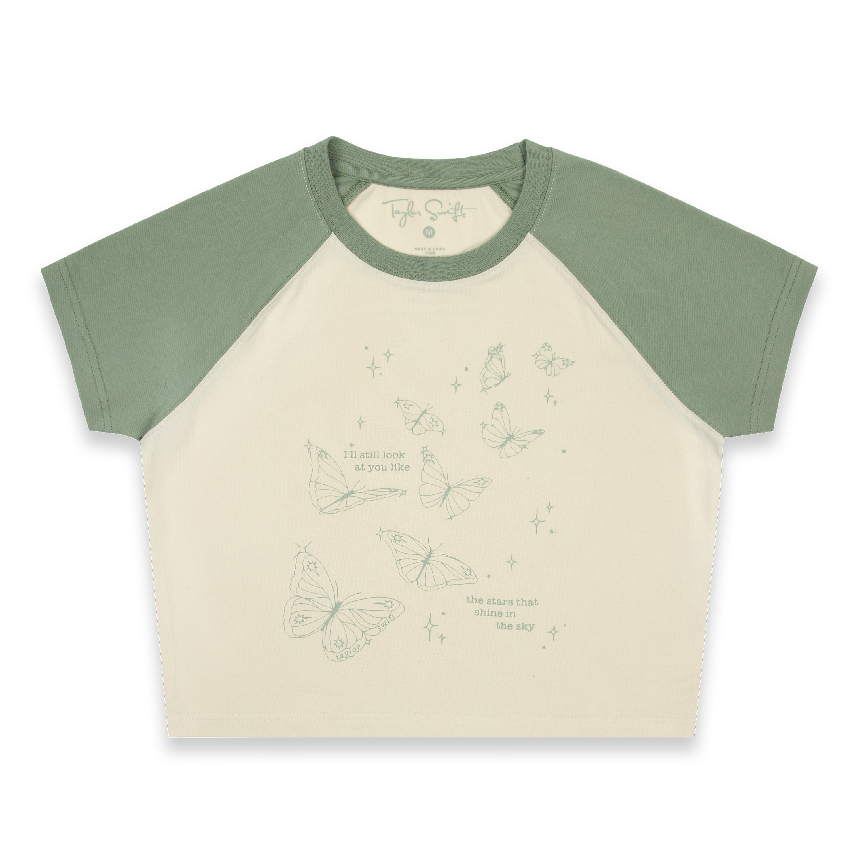 Cream and green baby t-shirt featuring "I'll still look at you like the stars that shine in the sky" song lyrics with butterfly and star design printed on front.