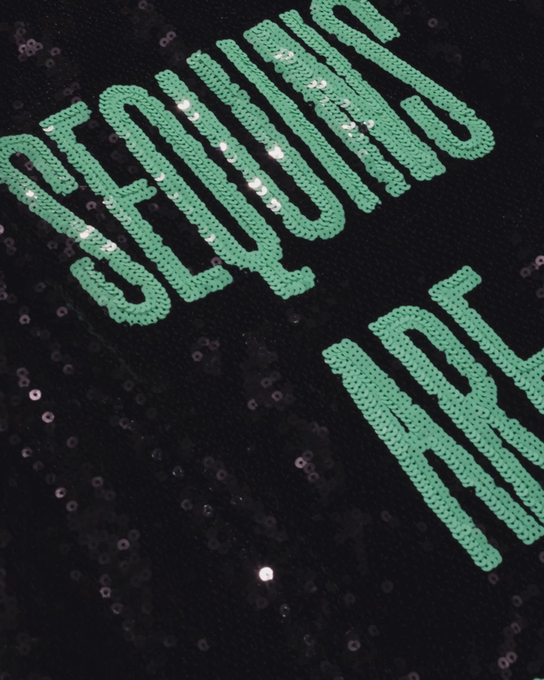 BLACK SEQUIN T-SHIRT DRESS FEATURING "SEQUINS ARE FOREVER" SONG LYRICS IN MINT GREEN ON FRONT.