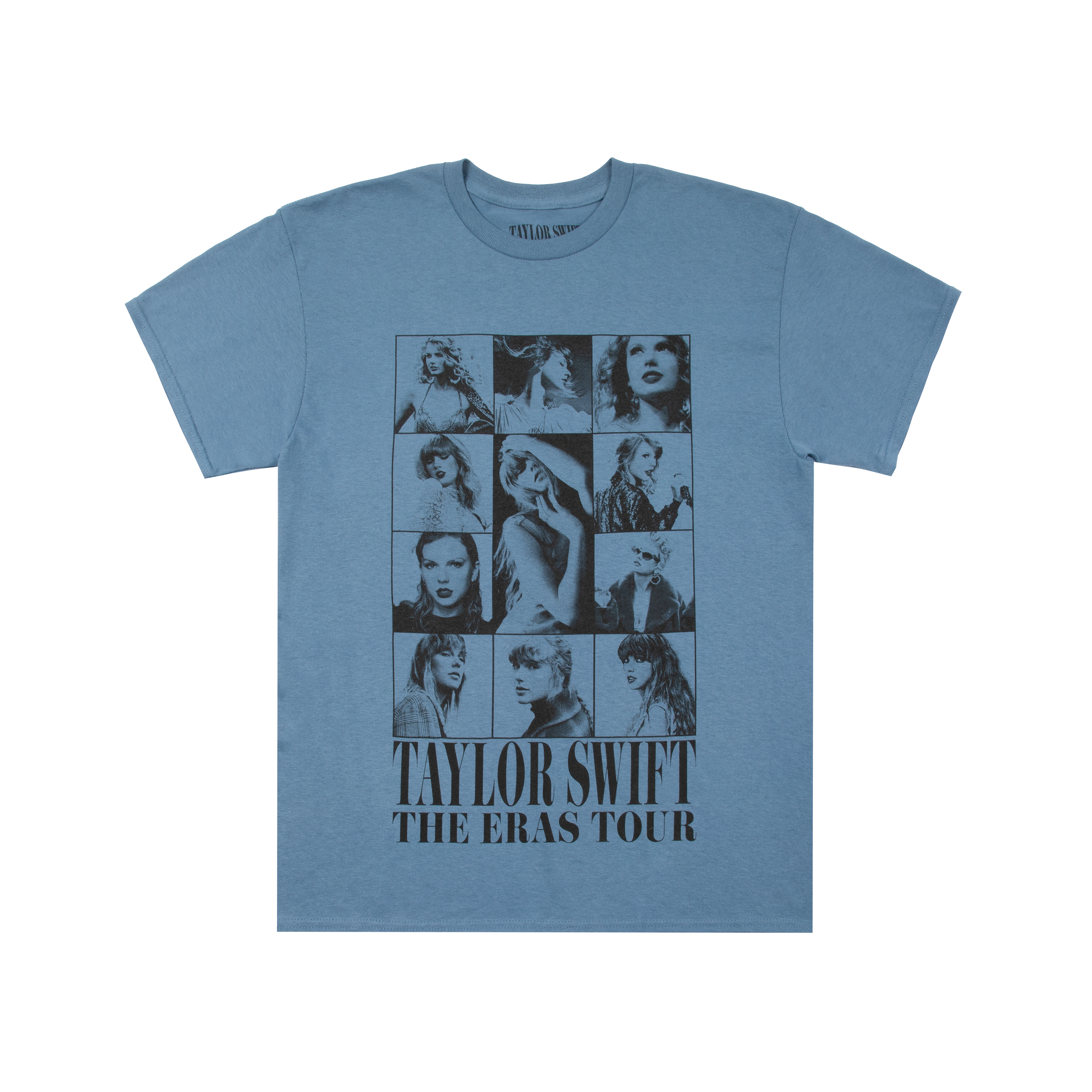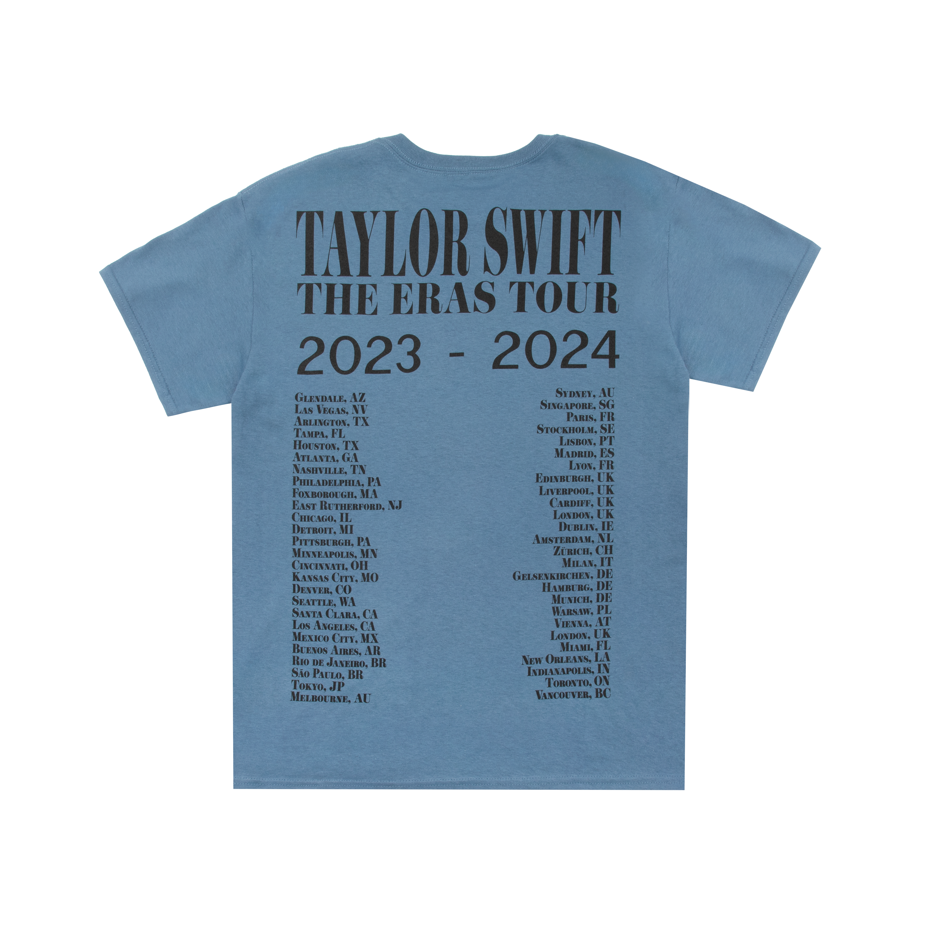Blue t-shirt featuring photos of Taylor Swift and "Taylor Swift The Eras Tour" printed on front and "Taylor Swift The Eras Tour 2023-2024" and tour locations printed on back.