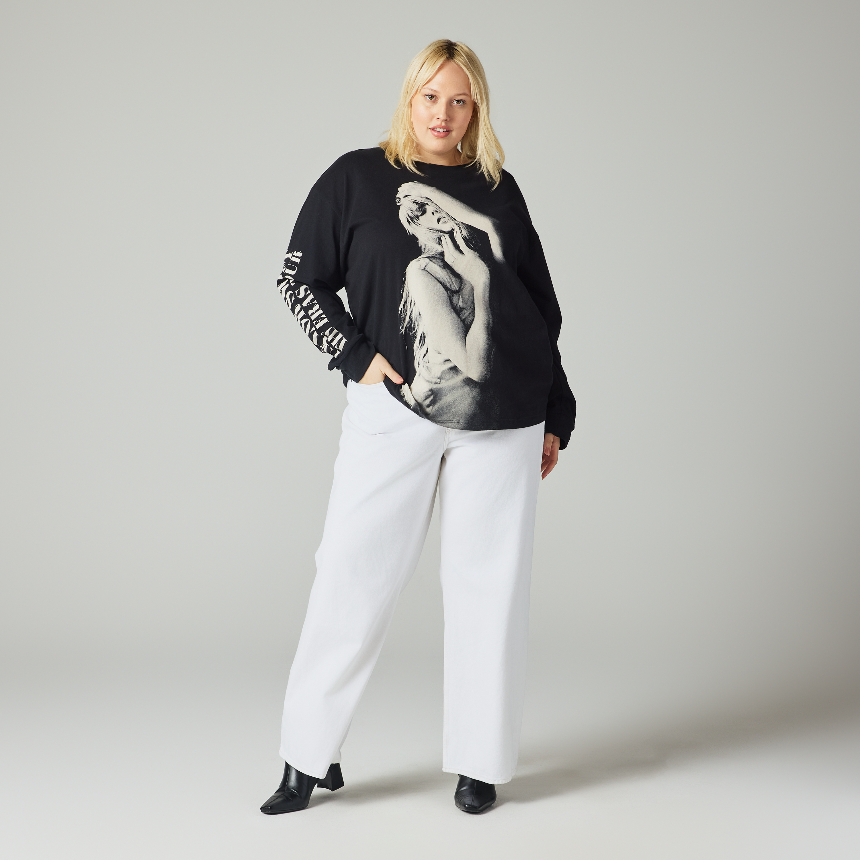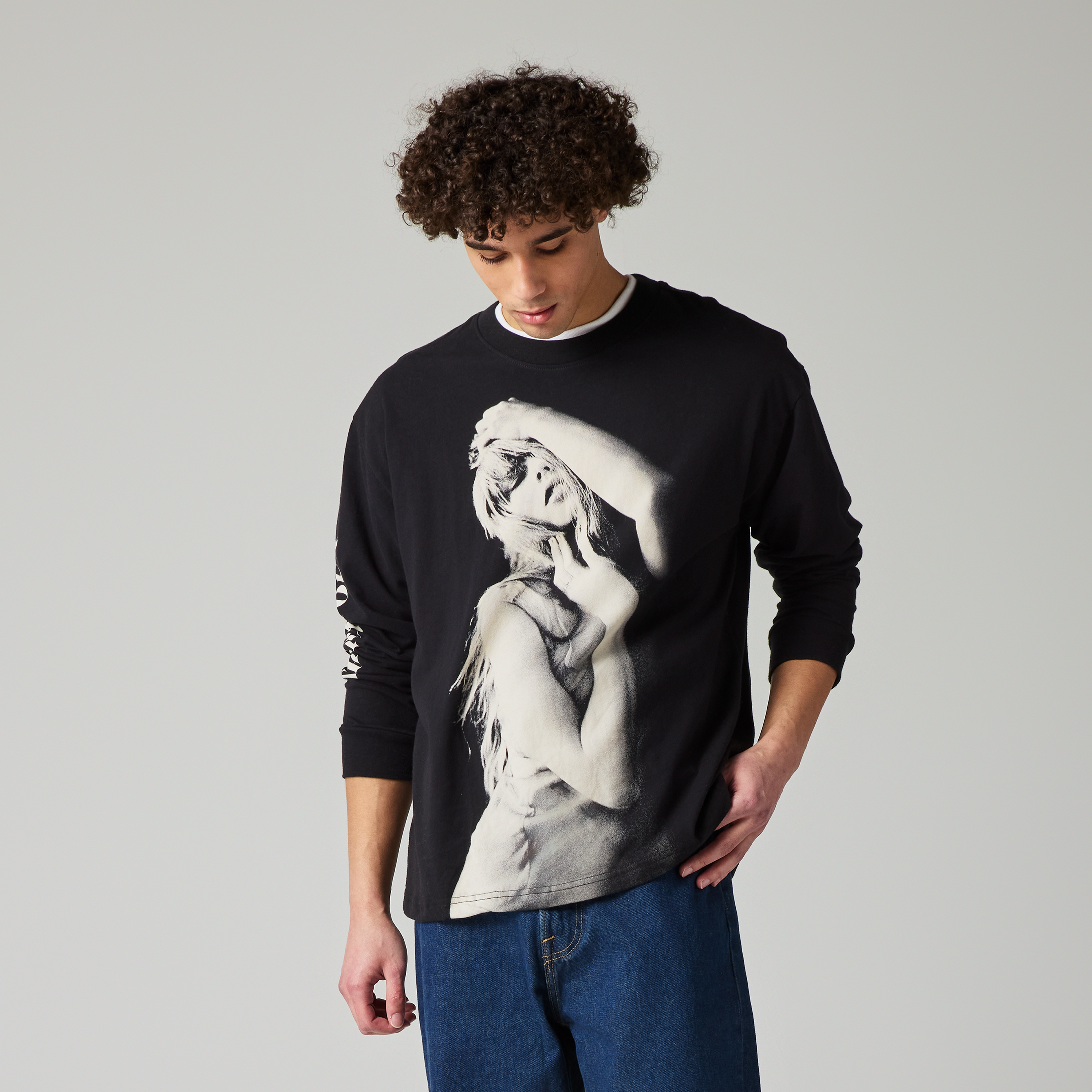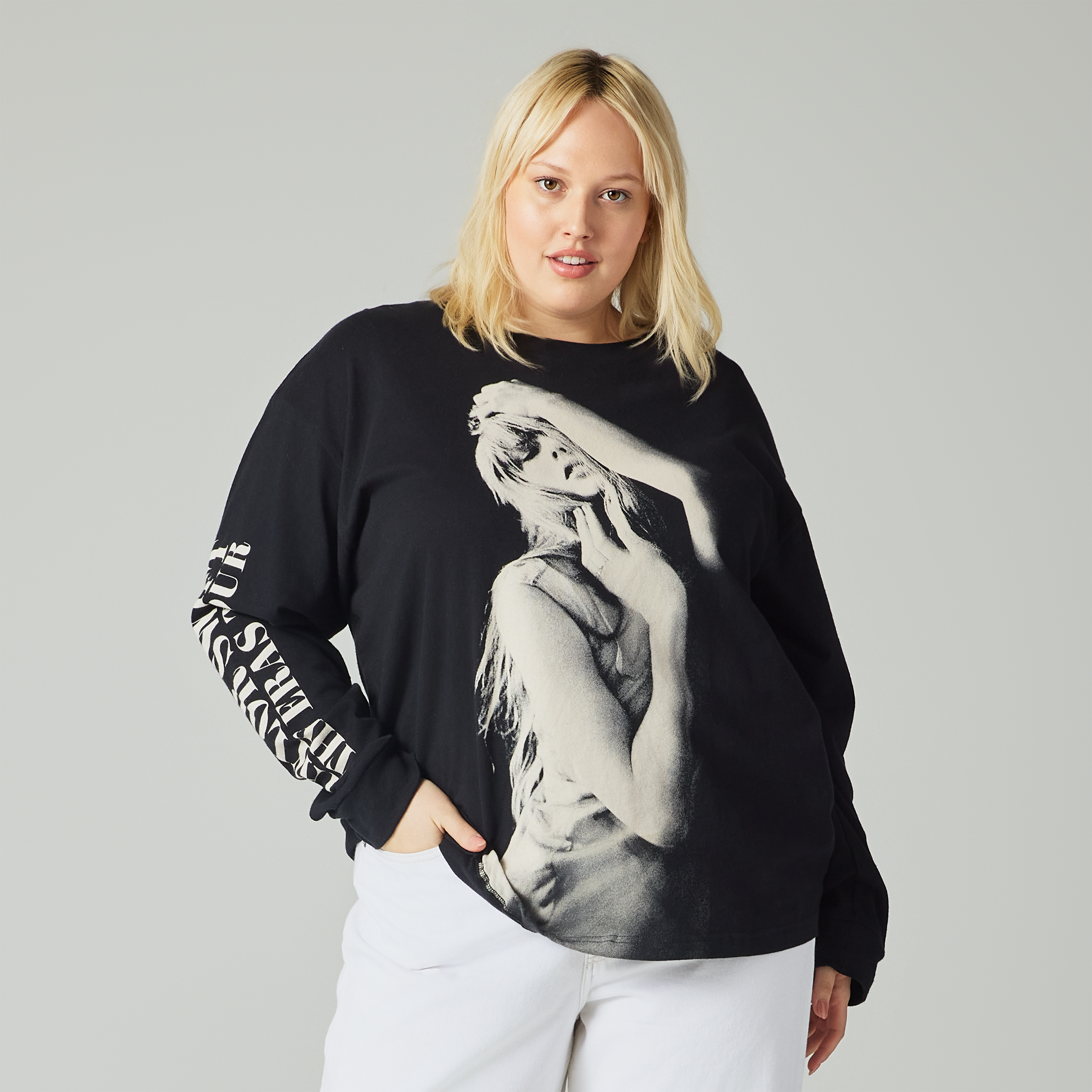 Black long sleeve featuring "Taylor Swift The Eras Tour" printed on wearer's right sleeve and photo of Taylor Swift printed on front.