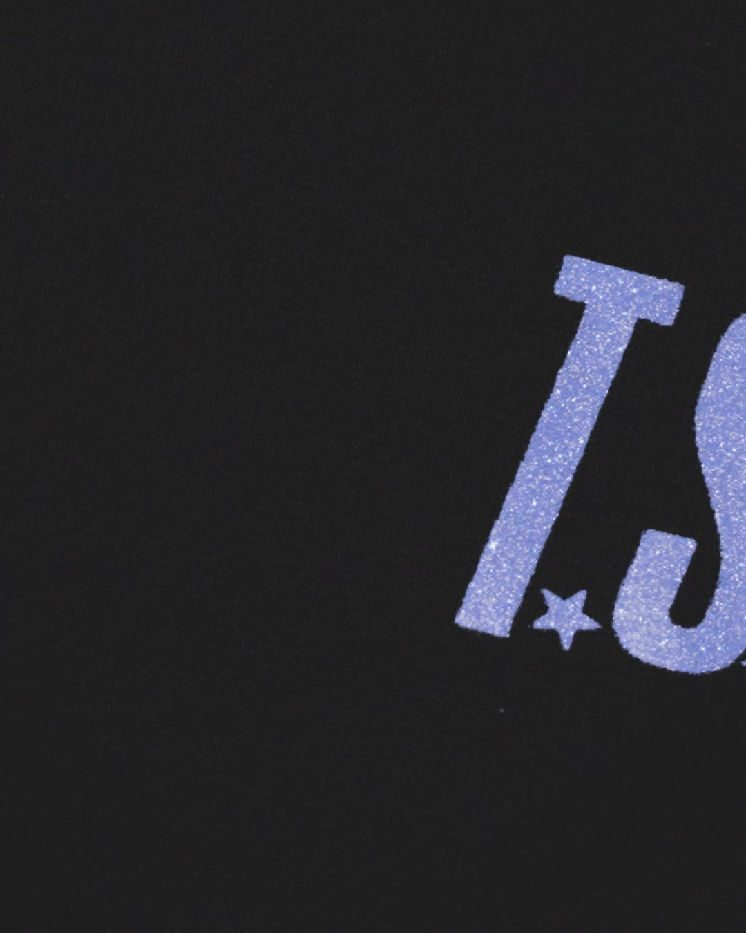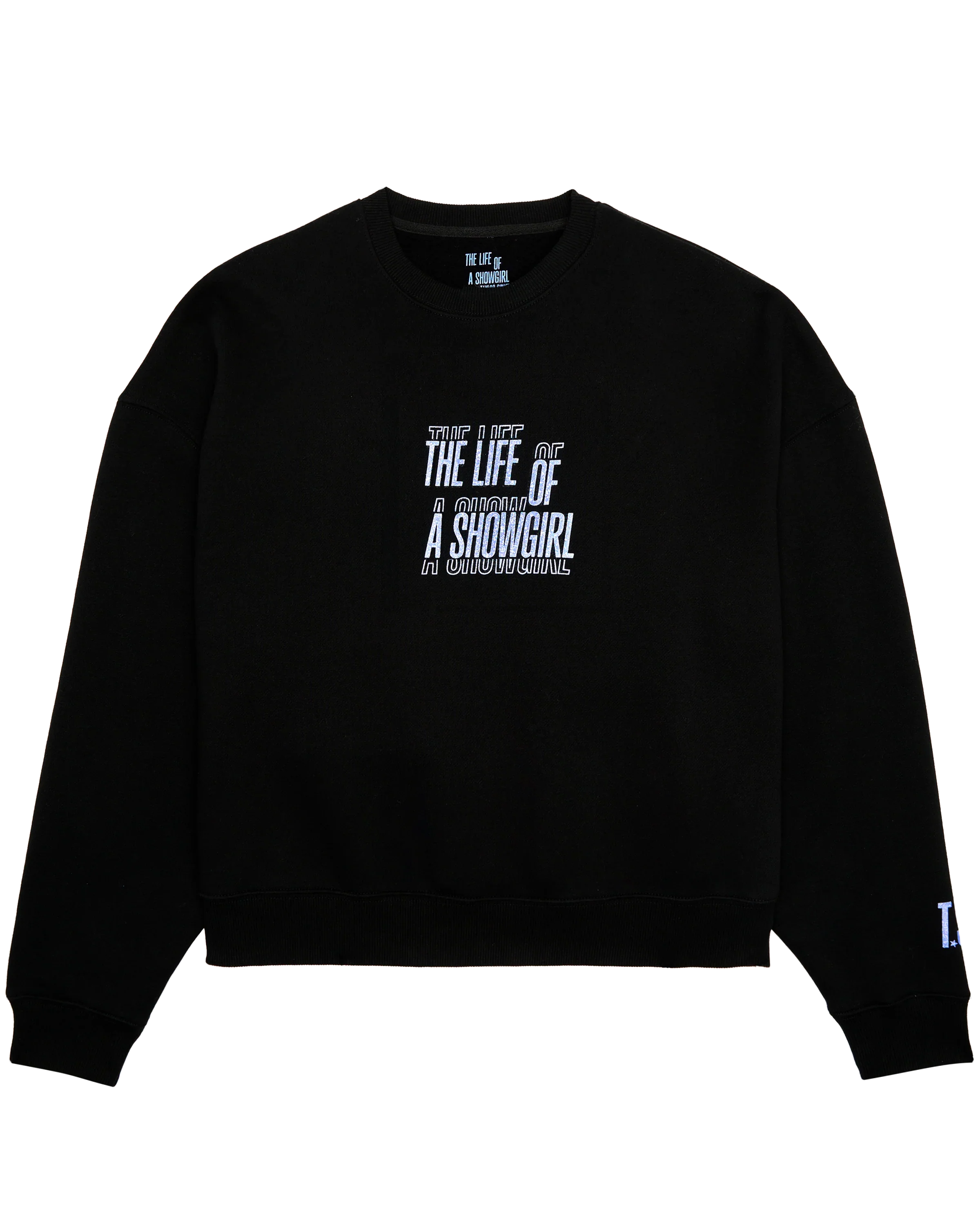 BLACK LONG SLEEVE CREWNECK SWEATSHIRT FEATURING "THE LIFE OF A SHOWGIRL" ALBUM LOGO IN VIOLET SPARKLE PRINT ON FRONT AND "THE LIFE OF A SHOWGIRL" ALBUM LOGO IN VIOLET SPARKLE WITH PHOTOS OF TAYLOR SWIFT PRINTED ON BACK.