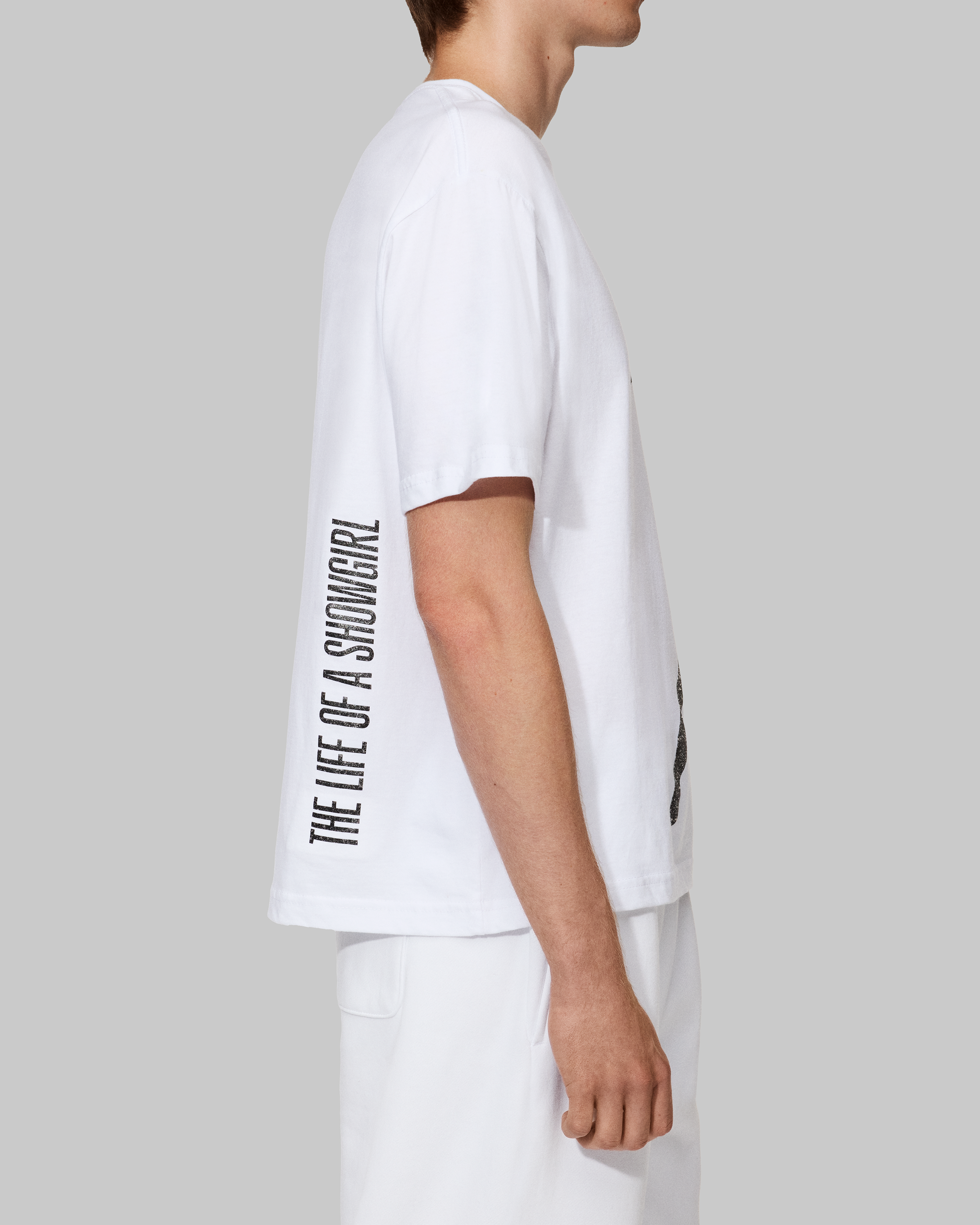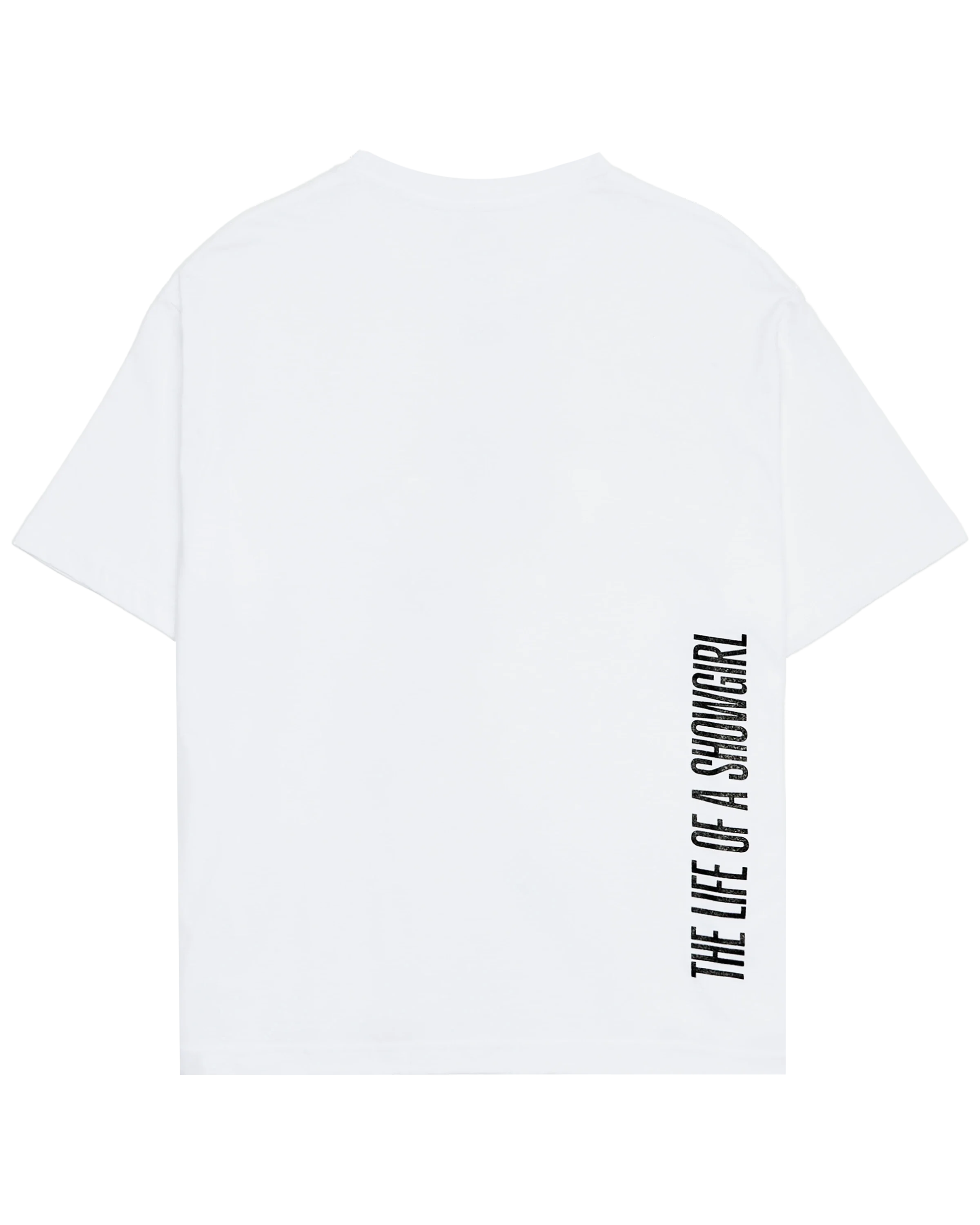 WHITE T-SHIRT FEATURING PHOTO OF TAYLOR SWIFT WITH BLACK GLITTER OUTFIT ACCENTS PRINTED ON FRONT AND "THE LIFE OF A SHOWGIRL" ALBUM LOGO PRINTED ON BACK.
