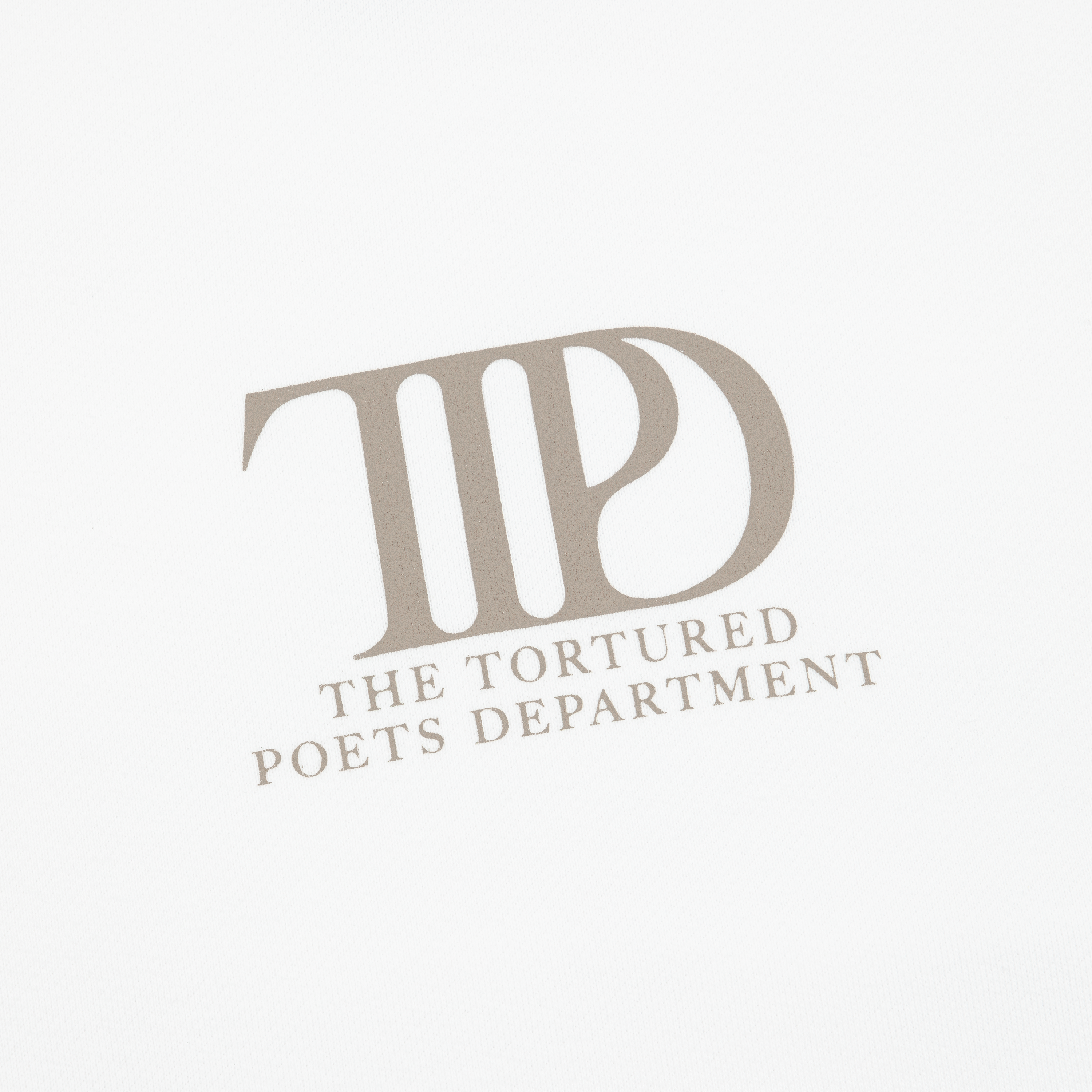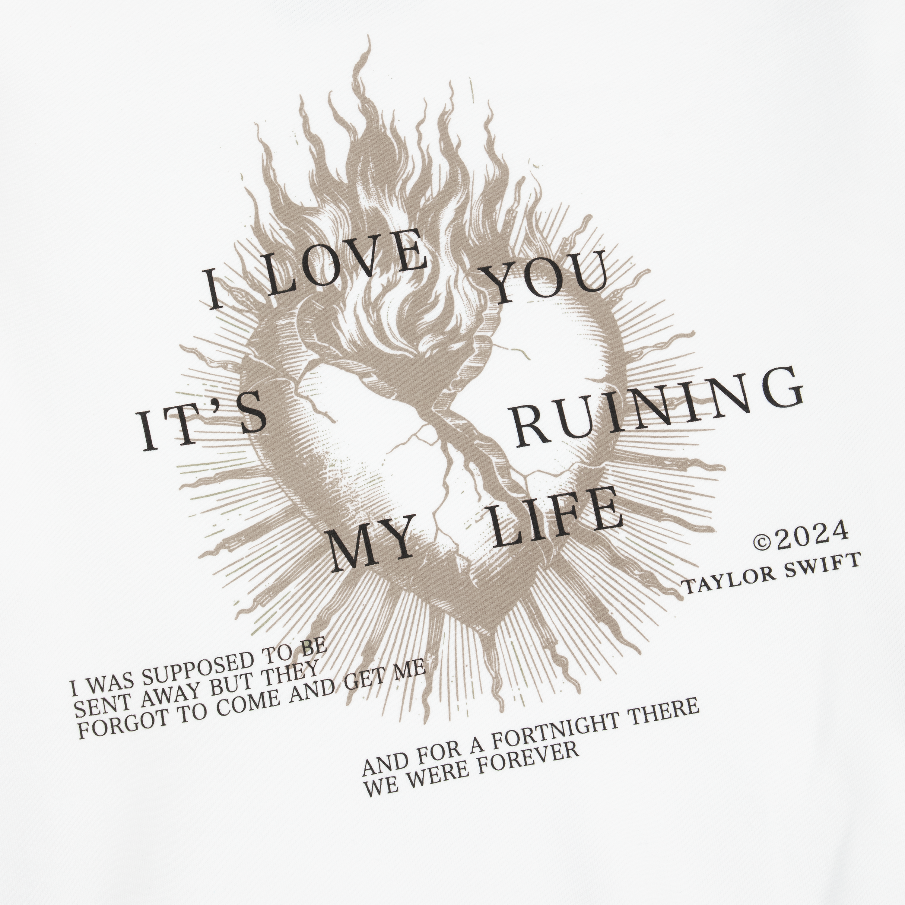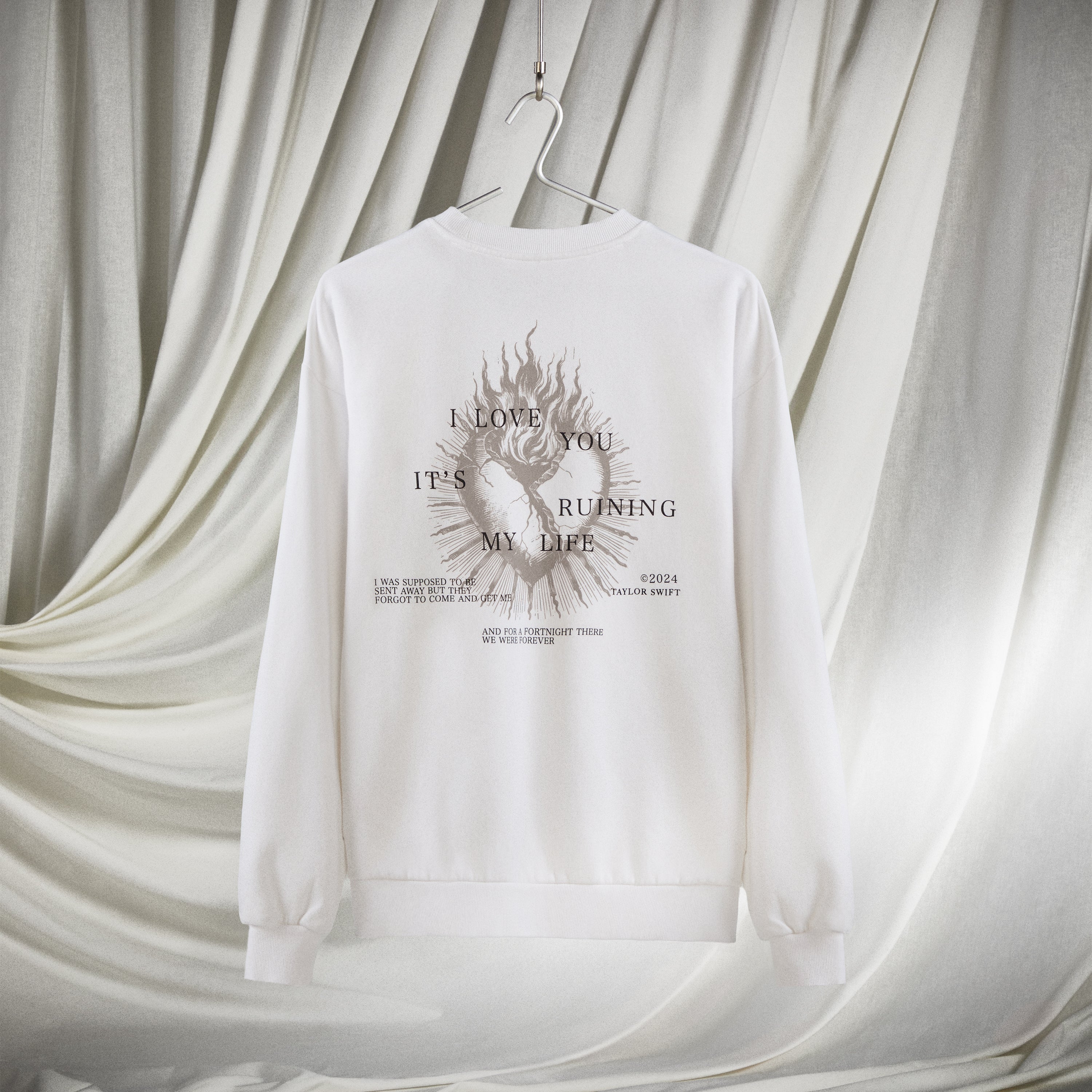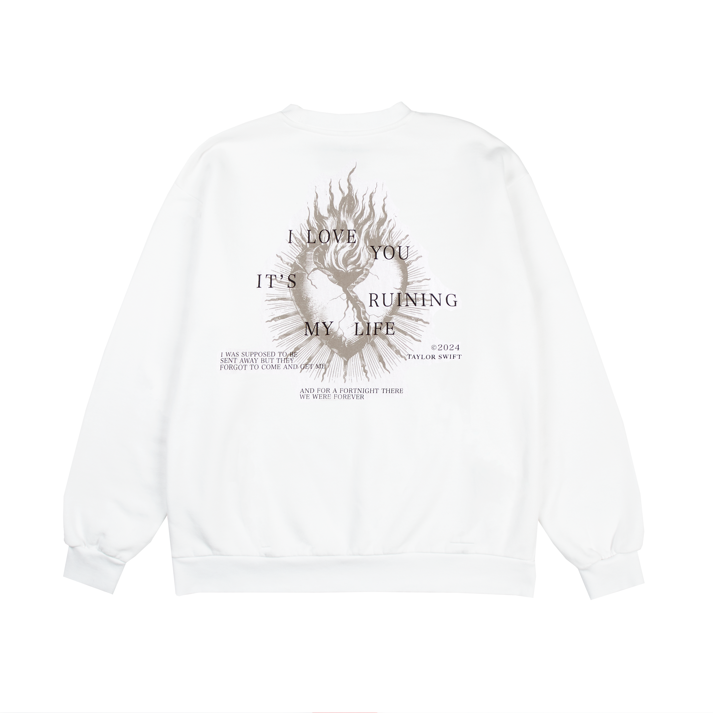 White crewneck featuring "TTPD" album logo and "The Tortured Poets Department" printed on front with a heart and flames design, "I Love You It's Ruining My Life" song lyrics, "I Was Supposed To Be Sent Away But They Forgot To Come And Get Me" song lyrics, "And For A Fortnight There We Were Forever" song lyrics, and "©2024 Taylor Swift" printed on back.