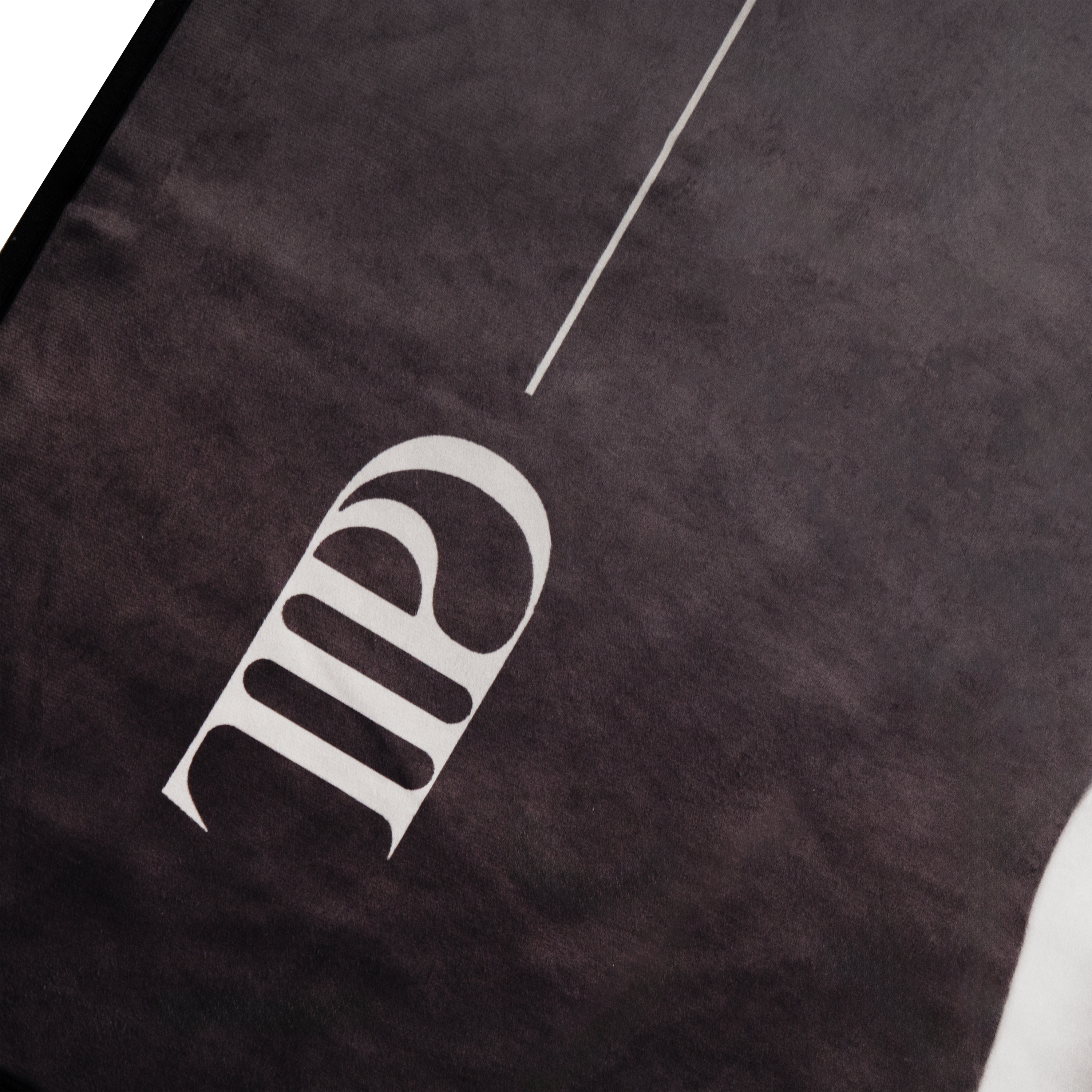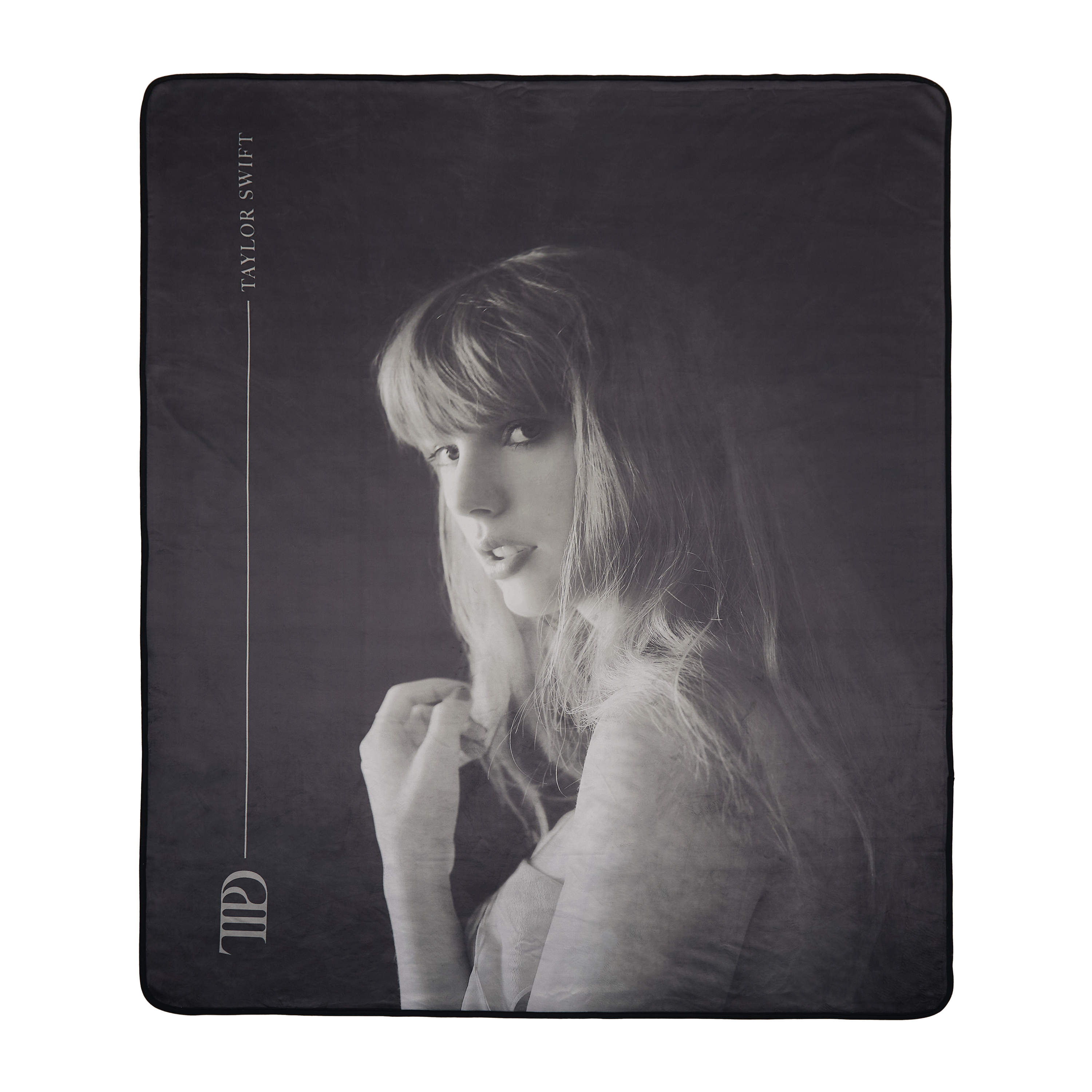 Dark gray fleece blanket featuring photo of Taylor Swift with "TTPD" and "Taylor Swift" with line design printed on front.