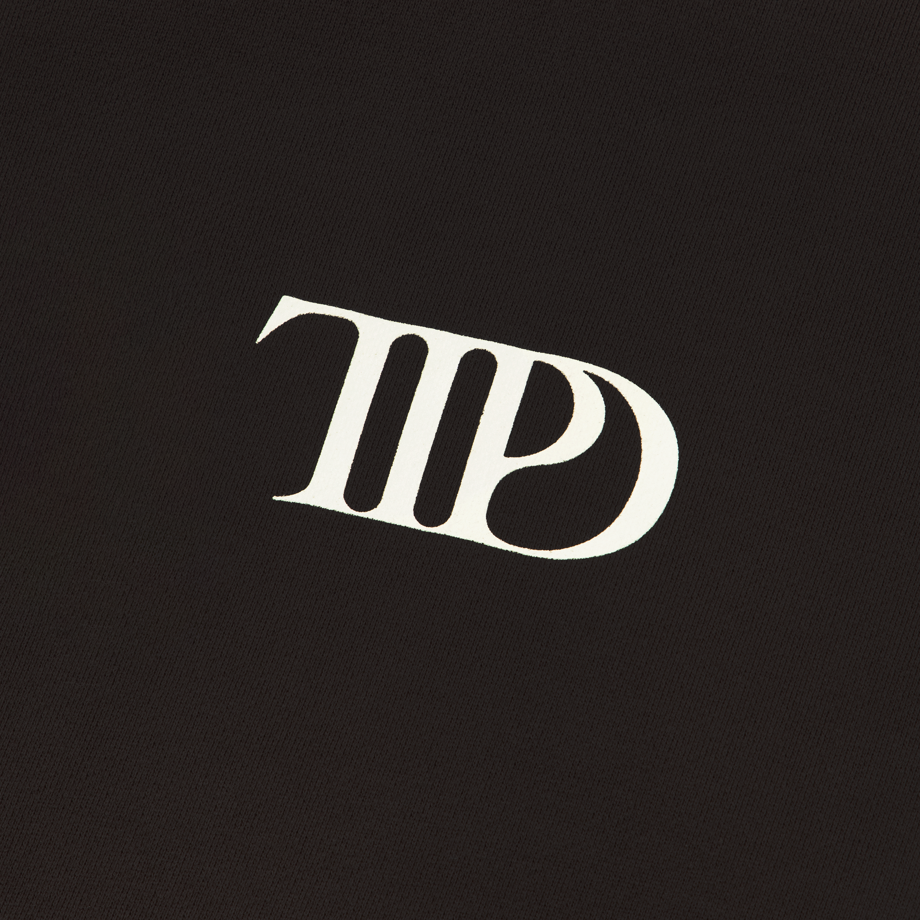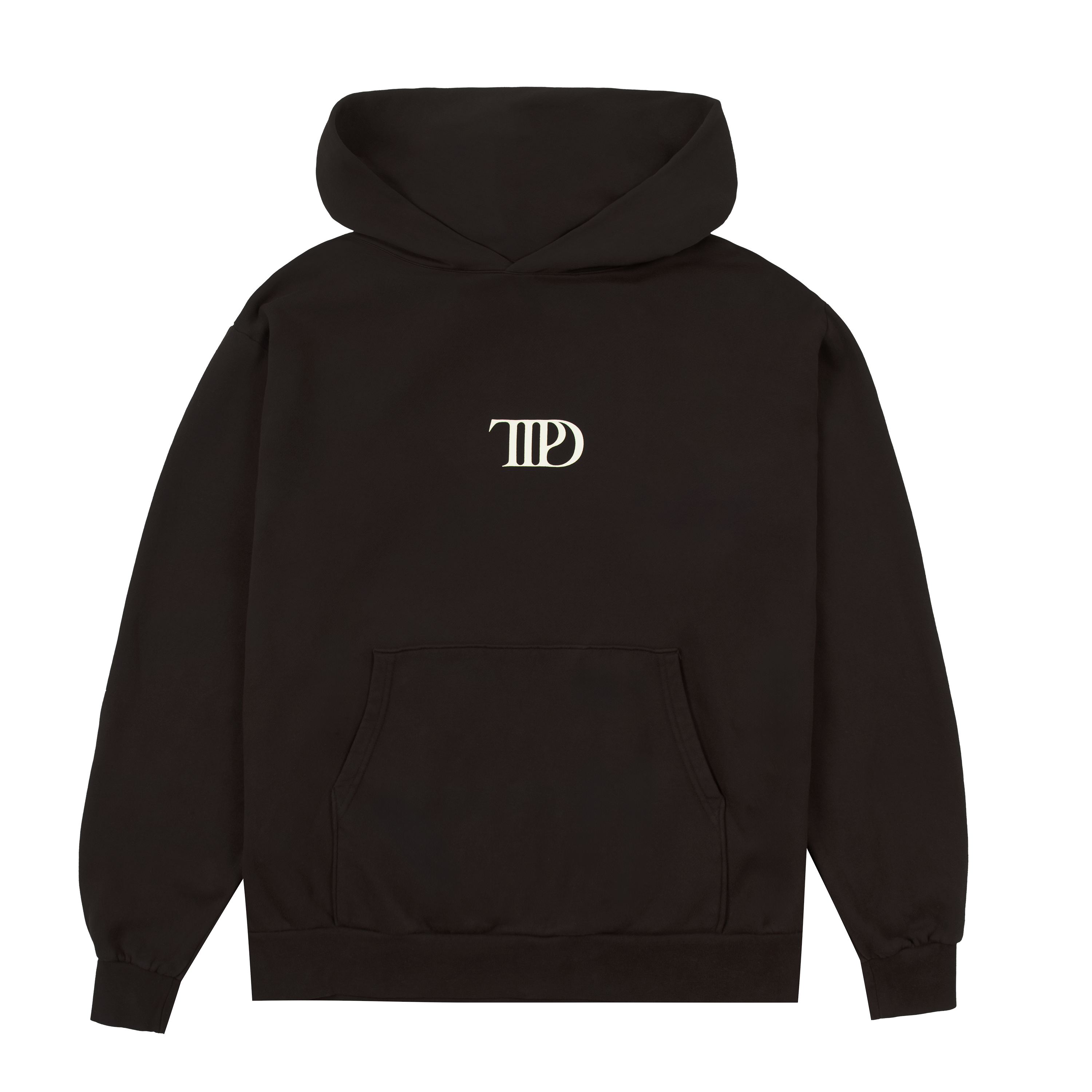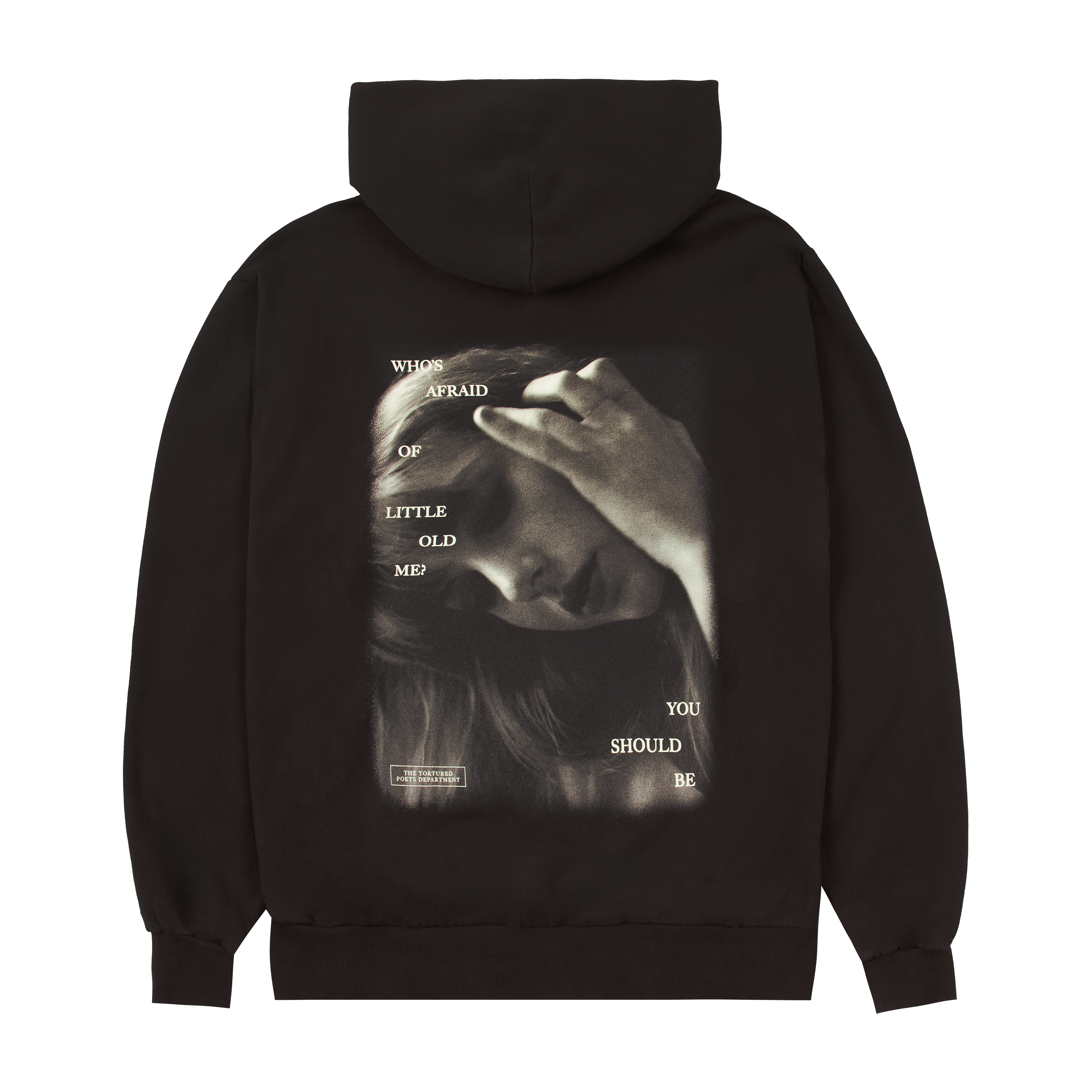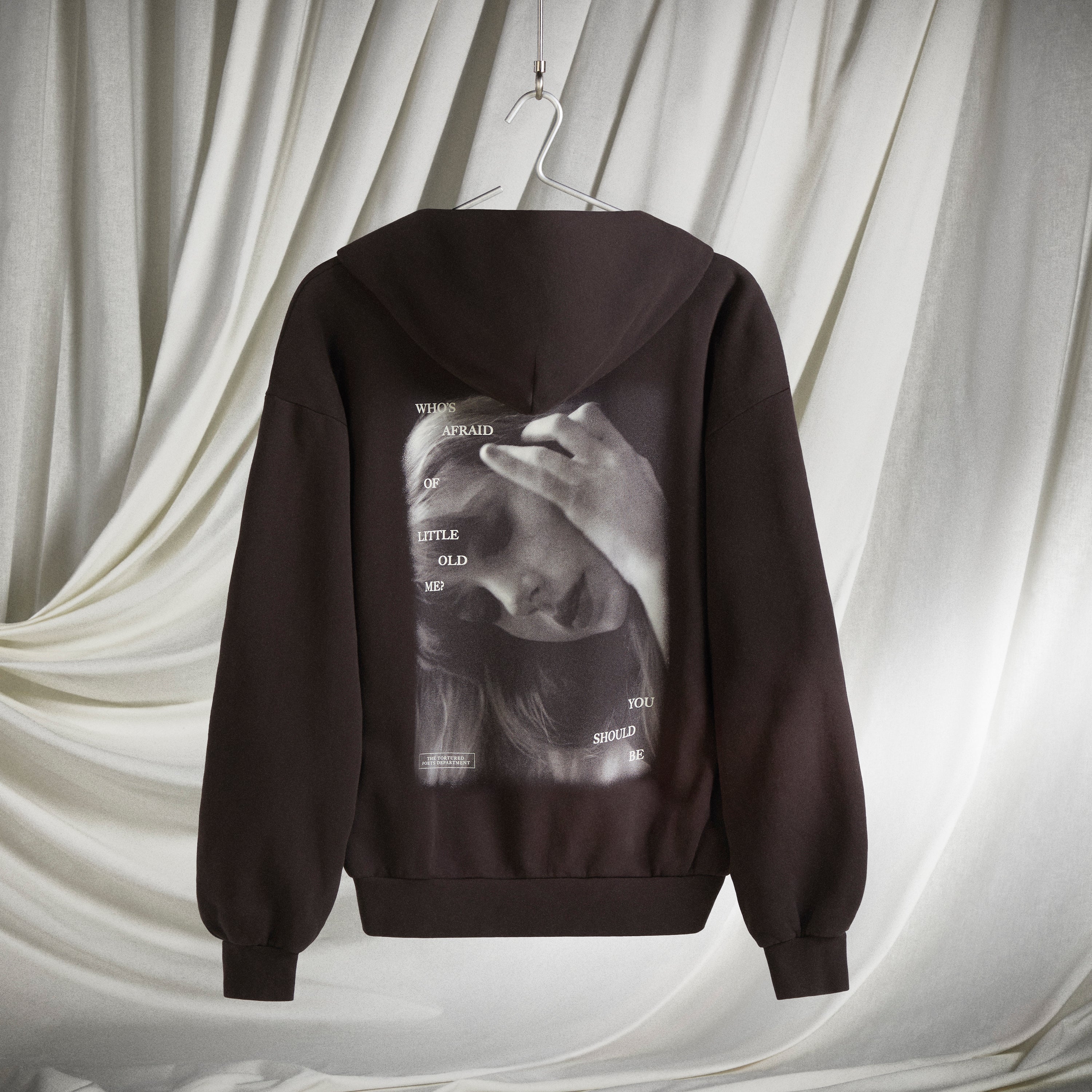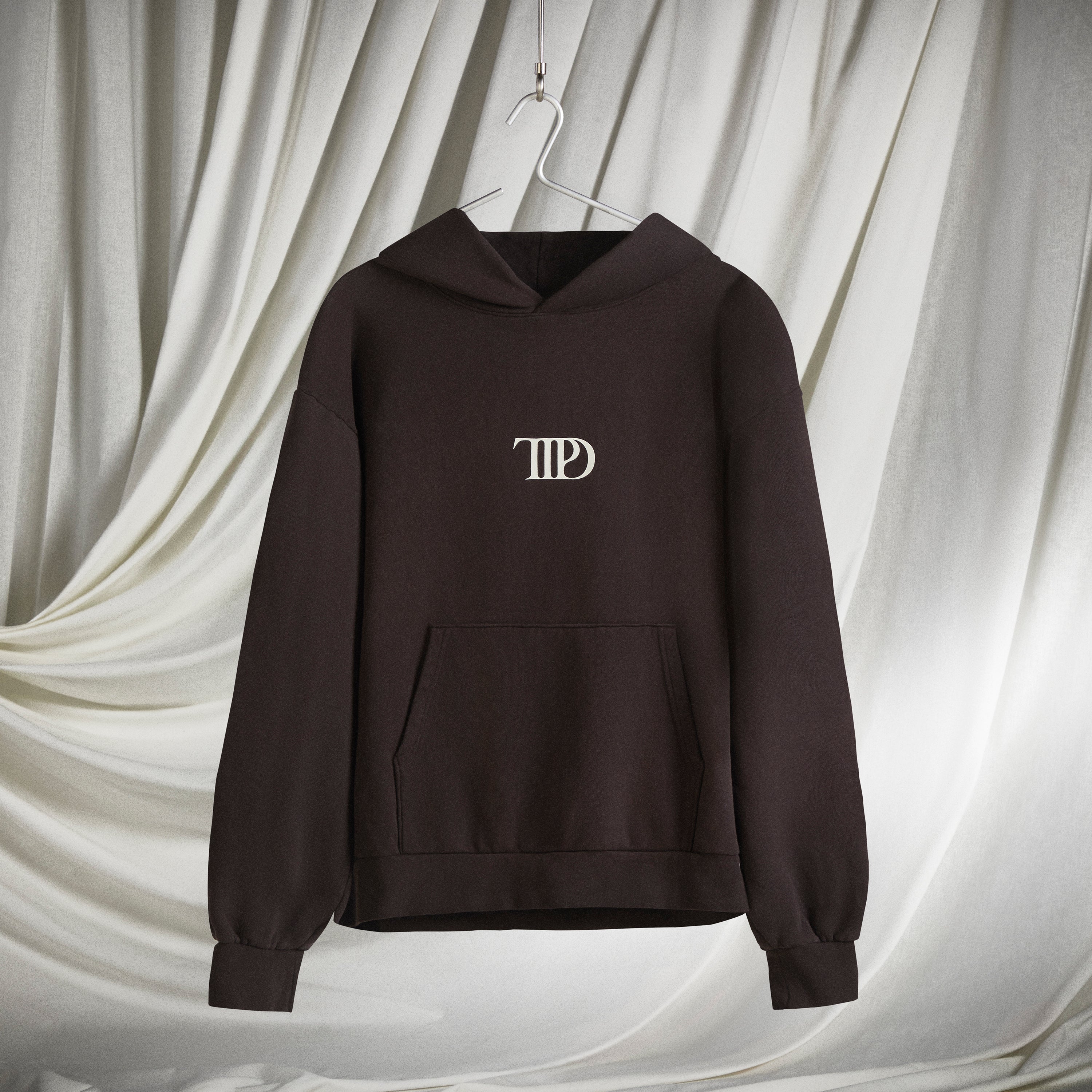 Dark brown hoodie with front pocket featuring "TTPD" album logo printed on front and photo of Taylor Swift, "Who's Afraid Of Little Old Me?" song lyrics, "You Should Be" song lyrics and "The Tortured Poets Department" in box design printed on back.